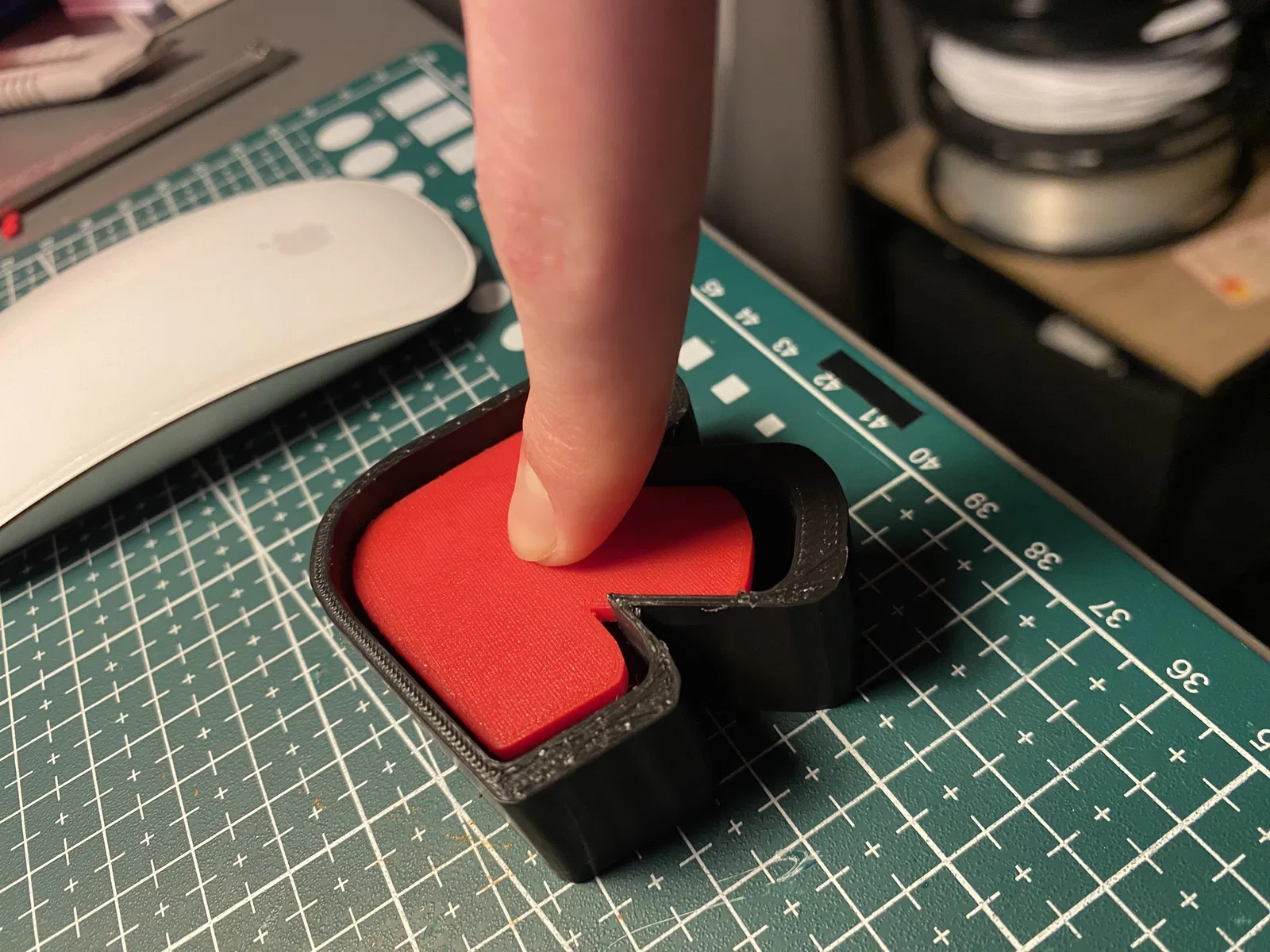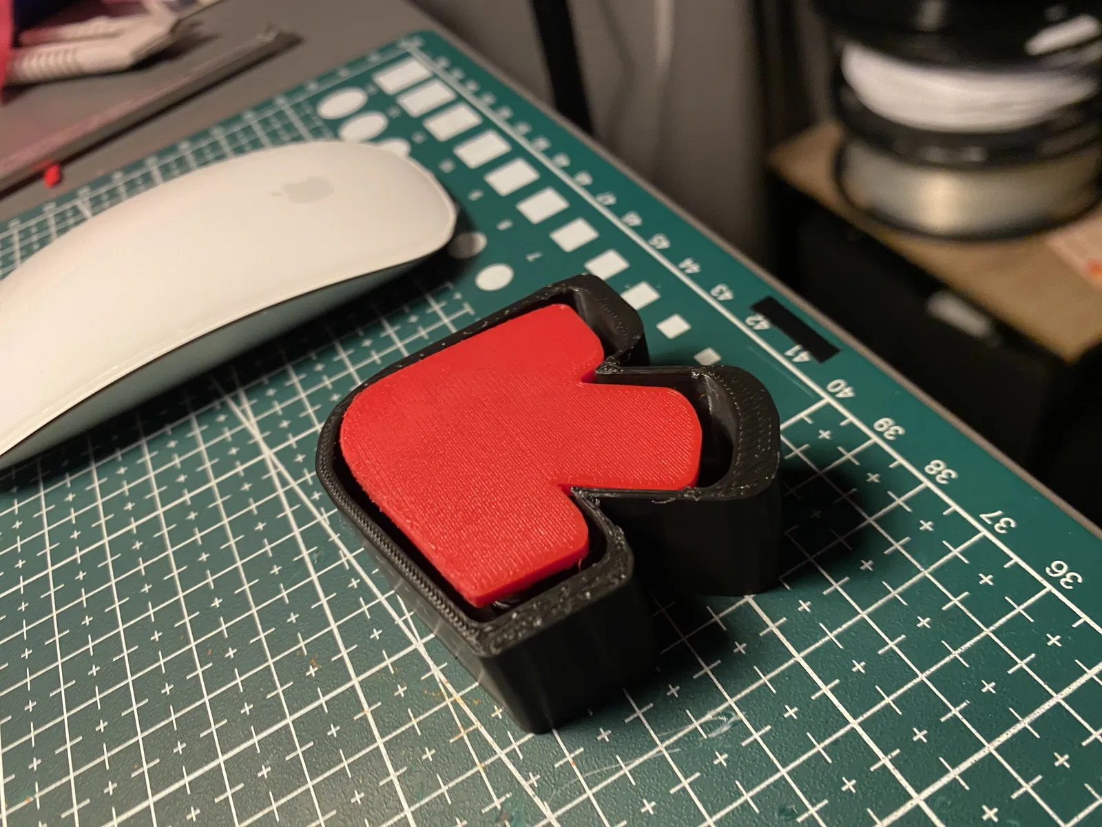 Thiết kế của món đồ chơi này khá đơn giản nhưng vô cùng tinh tế, bao gồm phần khung bên ngoài và nút bấm hình mũi tên ở trung tâm. Bạn chỉ cần in các bộ phận riêng biệt và lắp ráp lại với nhau để tạo thành một chiếc 'clicker' hoàn chỉnh. Cảm giác nhấn vào nút mũi tên màu đỏ nổi bật giữa khung viền đen chắc chắn sẽ tạo nên sự thích thú, đặc biệt là đối với những người hay có thói quen gõ ngón tay hoặc nghịch đồ vật khi suy nghĩ.
