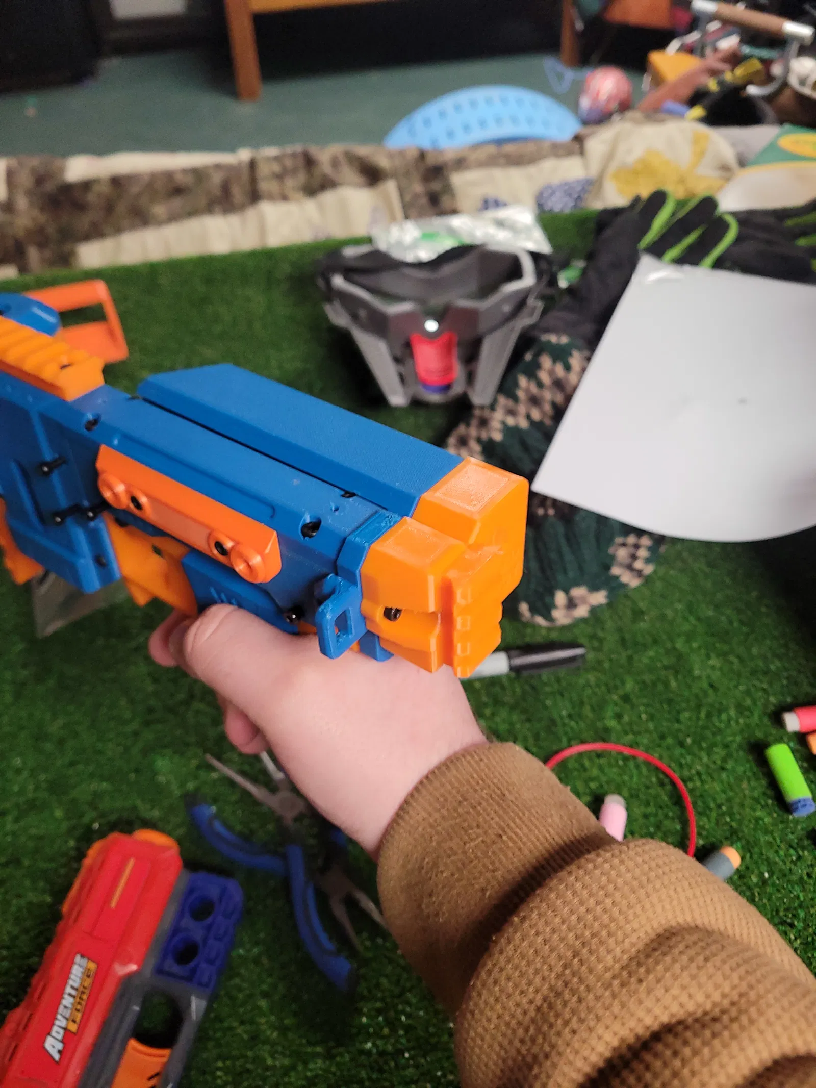 Mình đã thiết kế thêm một thanh Picatinny rail gắn phía sau khay pin bên phải để tiện cho việc lắp báng súng (stock) trên dòng Gryphon. Thiết kế này giúp mở rộng khả năng tùy biến cho blaster của bạn.