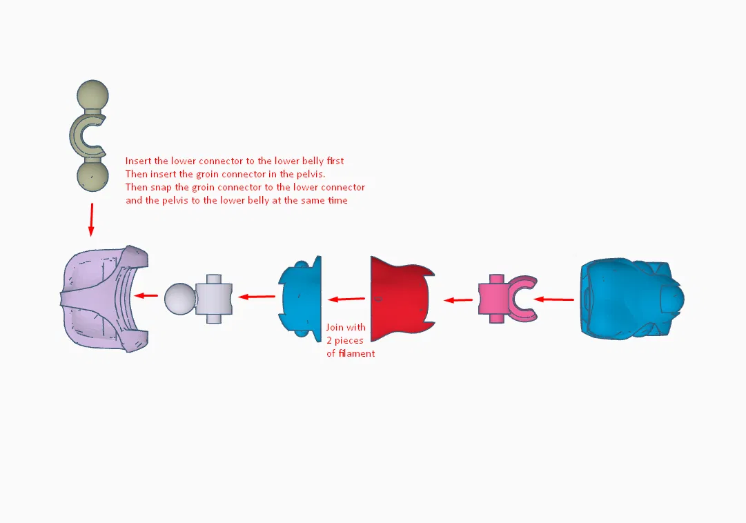 Mẫu figure Carbon 13 mới này rất tuyệt, nhưng mình thấy phần khớp nối bị lộ ra ở thân trên trông hơi lạc quẻ so với tổng thể mượt mà của mô hình. Vì vậy, mình quyết định tùy chỉnh lại phần thân từ bộ kit tương thích Frame Arms mà mình đã đăng trước đây, đồng thời cải tiến thêm để dễ in và chắc chắn hơn. Phiên bản của mình vẫn giữ được gần như toàn bộ khả năng cử động của phần thân gốc và bộ kit Frame Arms, nhưng giờ đây các khớp bụng đã được giấu vào bên trong, giúp figure trông mượt mà và thực tế hơn nhiều. Một trong những hình ảnh đính kèm có minh họa cách lắp ráp. Phần khó nhất là ở khung chậu, vì bạn phải cùng lúc khớp phần khớp háng vào cổng nối dưới và phần khung chậu vào phần bụng dưới. Hai phần bụng cần được kết nối bằng hai đoạn dây nhựa (filament), khuyến khích dùng thêm một chút keo nhưng không bắt buộc. Ngoài ra còn có một phiên bản không có vết cắt trên các linh kiện tùy chọn; phiên bản đó nên dùng cùng với khung chậu tùy chọn và cổng nối chân gắn ở mặt dưới.