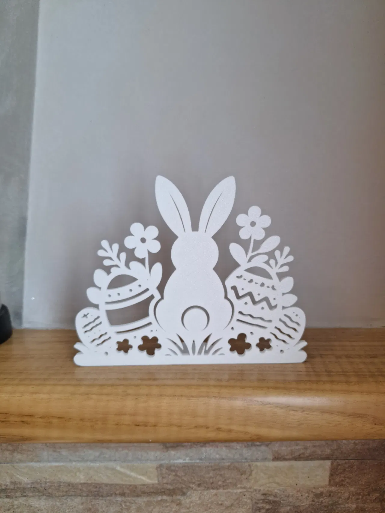 Đây là một mô hình trang trí Phục sinh dạng đứng cực kỳ dễ thương, hoàn hảo để bạn tô điểm không khí lễ hội cho ngôi nhà của mình. Thiết kế khắc họa một chú thỏ cách điệu đáng yêu vây quanh là những quả trứng được trang trí và hoa cỏ, tạo nên một bố cục nhẹ nhàng mang hơi thở mùa xuân.