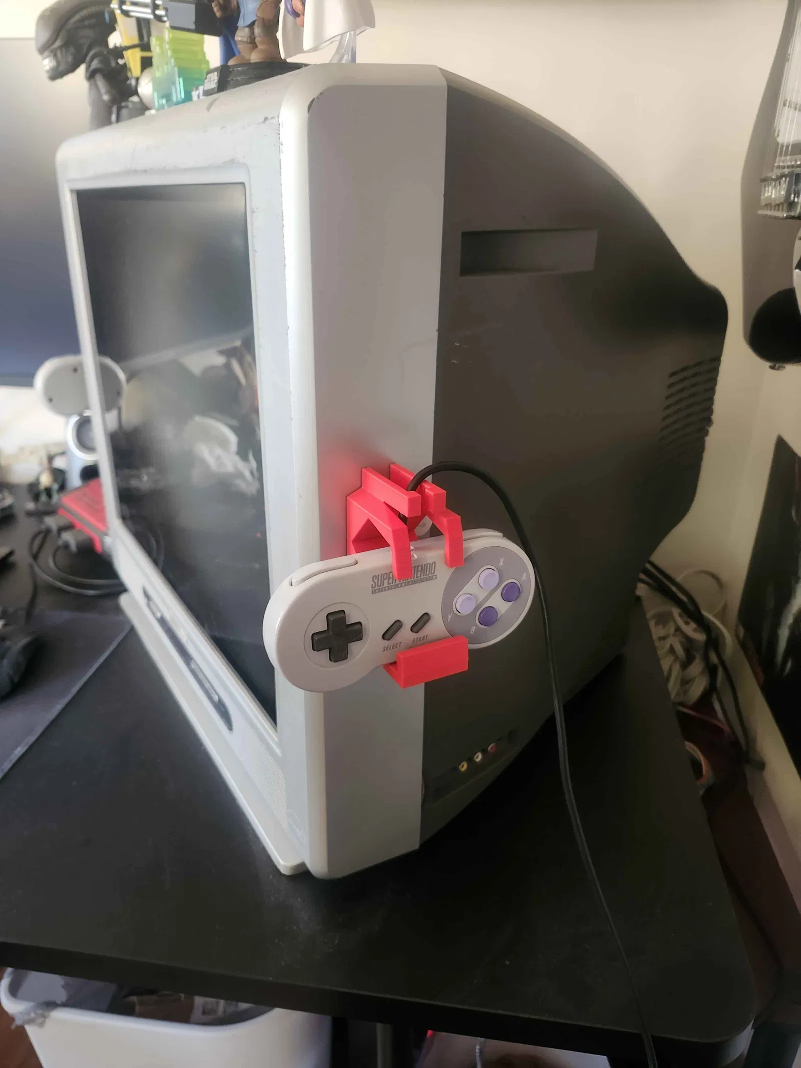 Tui thấy phiền quá khi cứ phải tìm chỗ để cái tay cầm Super Nintendo trên bàn, nên tui đã tự thiết kế một cái giá đỡ có thể dán vào cạnh tivi CRT bằng băng keo Command. Tui còn thiết kế thêm một khe để đặt dây cáp, giúp dây không bị gập gãy khi đi từ tay cầm ra ngoài. Món này dùng cực kỳ ngon lành luôn!