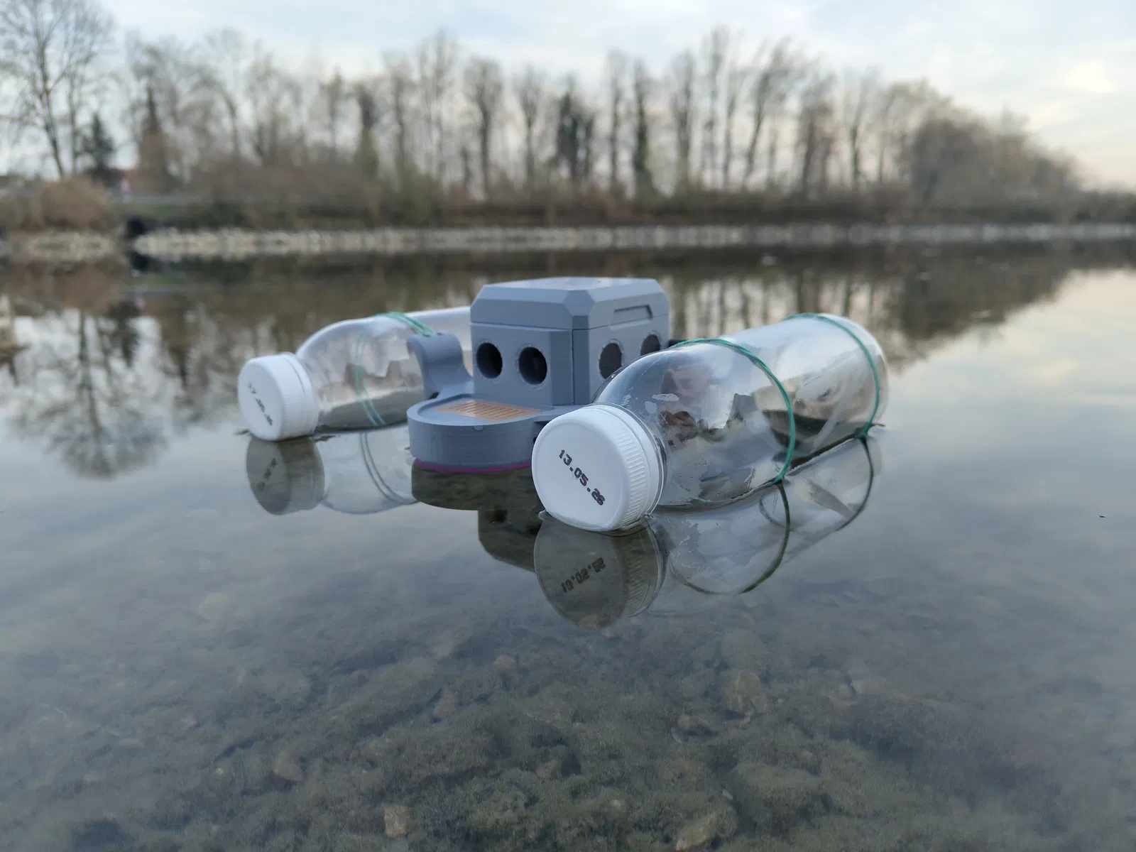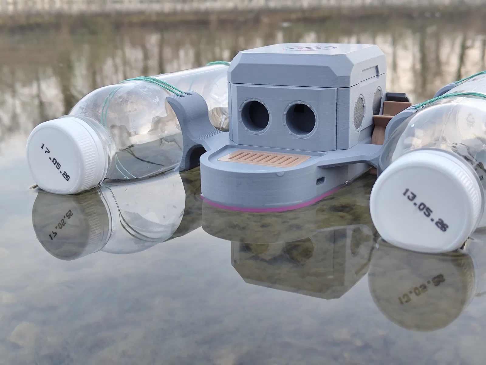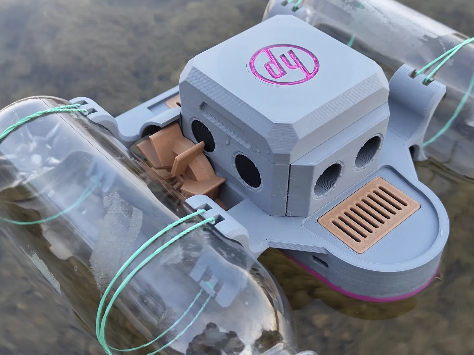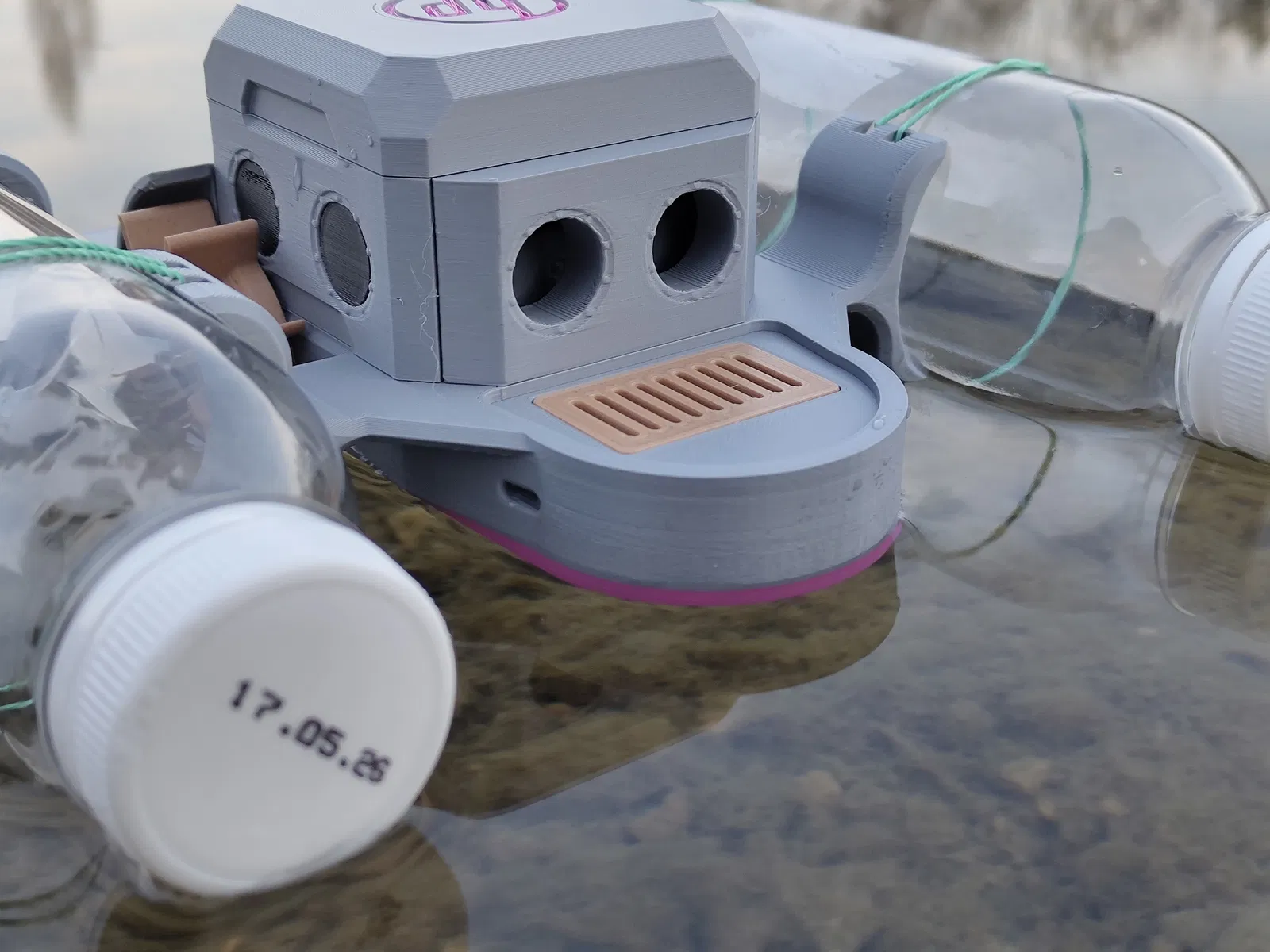 Robot được tích hợp vào một thân tàu chính được in 3D, được nâng đỡ bởi hai phao nổi làm từ chai nhựa PET thông thường, cố định bằng dây thun. Thiết kế này thay thế các bánh xe nguyên bản bằng bánh guồng, cho phép robot di chuyển trên mặt nước.