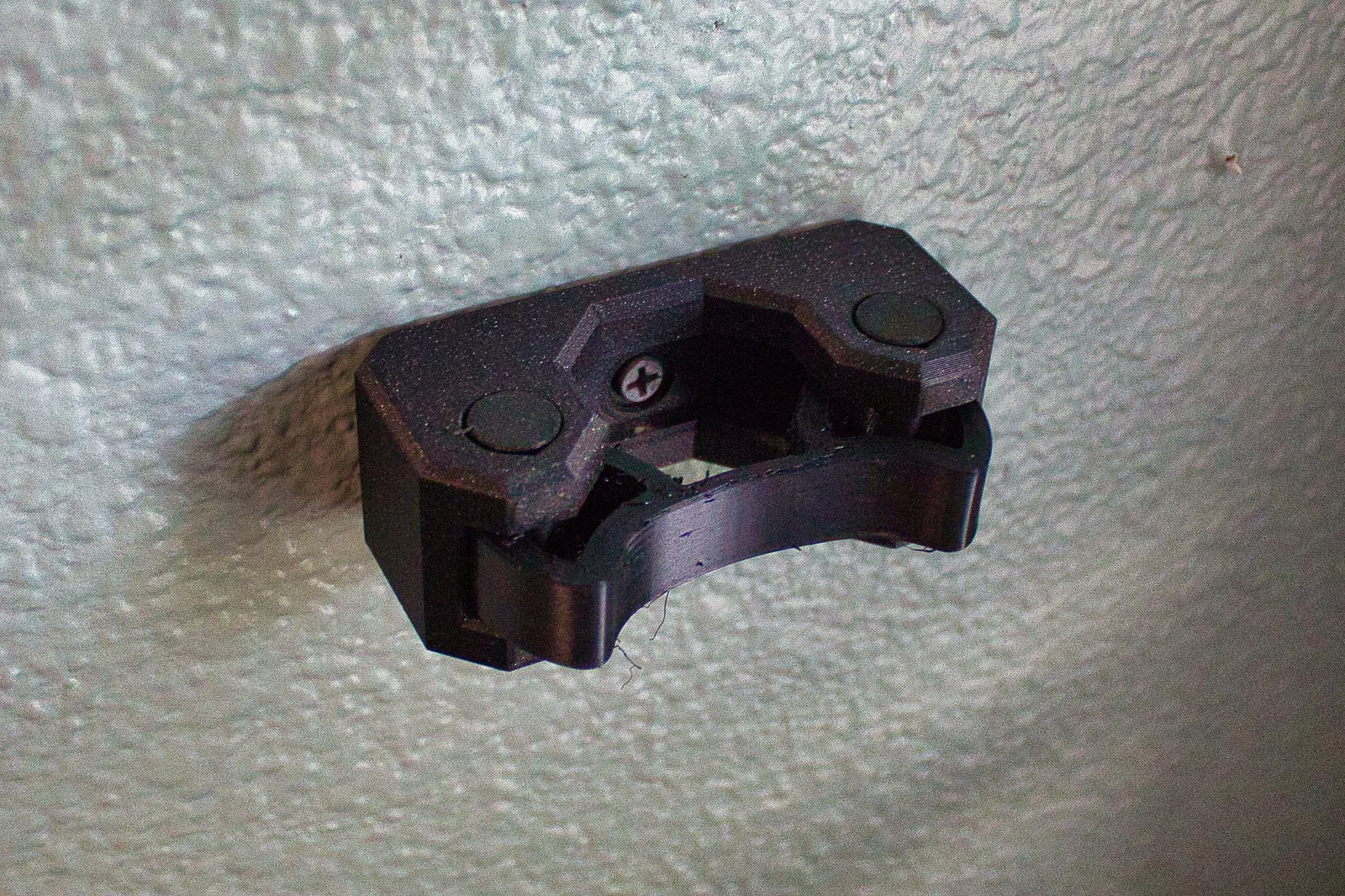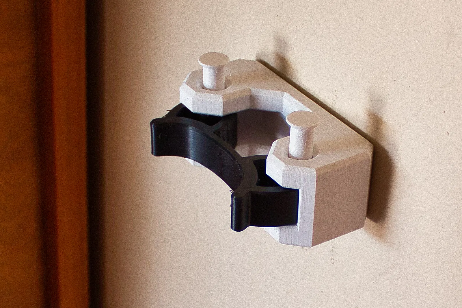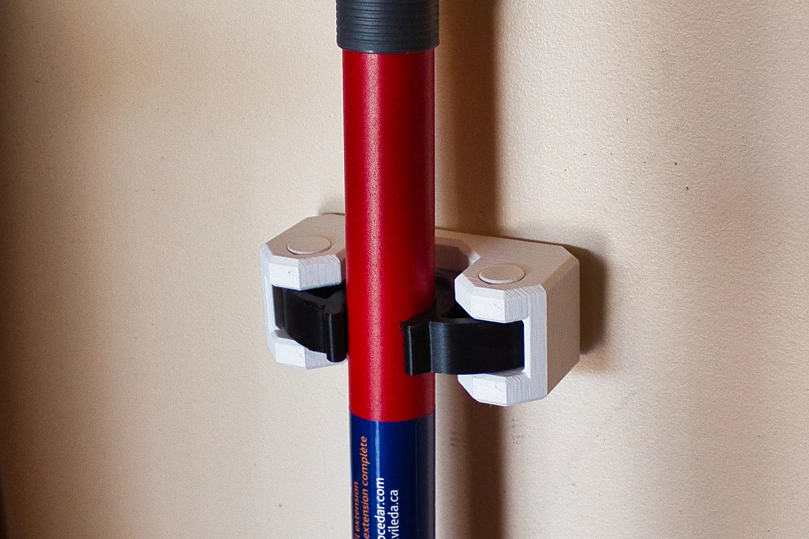 Chỉ cần đẩy cán chổi vào giữa hai hàm kẹp là nó sẽ giữ chặt ngay. Mẫu này được in kết hợp giữa nhựa Filaflex40 và PLA. Phần hàm kẹp linh hoạt khi in xong có thể hơi bị dính chỉ nhựa (stringy), nhưng chỉ cần dùng khò lửa xử lý sơ qua mặt ngoài là trông rất đẹp. Mình cố tình để lại phần chỉ nhựa ở mặt sau để tăng độ đàn hồi, giúp hàm kẹp tự mở ra dễ dàng hơn.