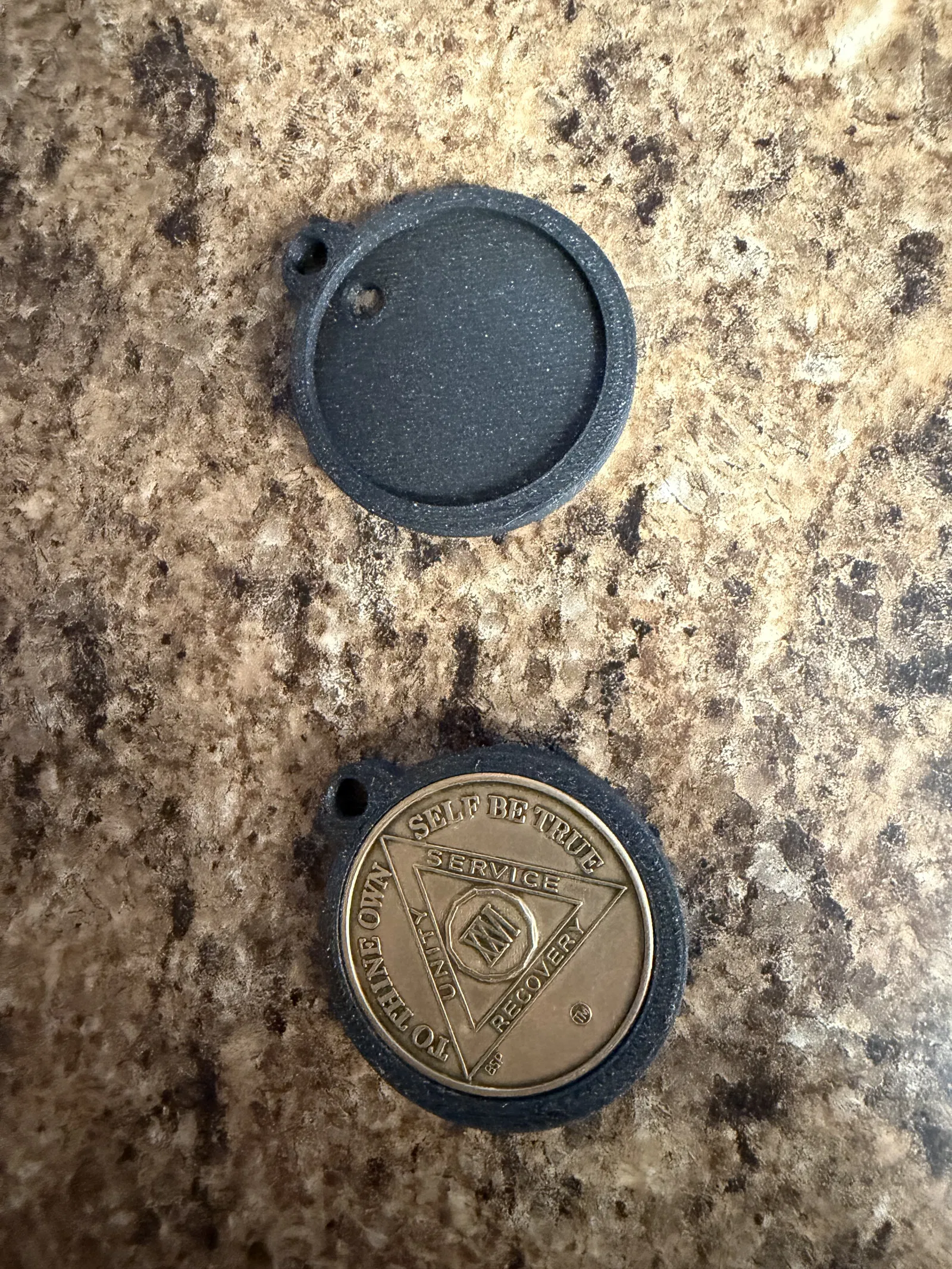 Móc khóa dùng để đựng đồng xu kỷ niệm Sobriety (thường được trao trong các buổi họp AA). Phần giữ xu có thiết kế một lỗ nhỏ ở phía sau giúp bạn dễ dàng đẩy đồng xu ra ngoài. Vì đồng xu được lắp vào khá khít, mình khuyên bạn nên cho một chấm nhỏ keo silicon vào bên trong trước khi đặt đồng xu vào. Cách này sẽ giúp giữ cố định đồng xu mà không làm hư hại bề mặt của nó.