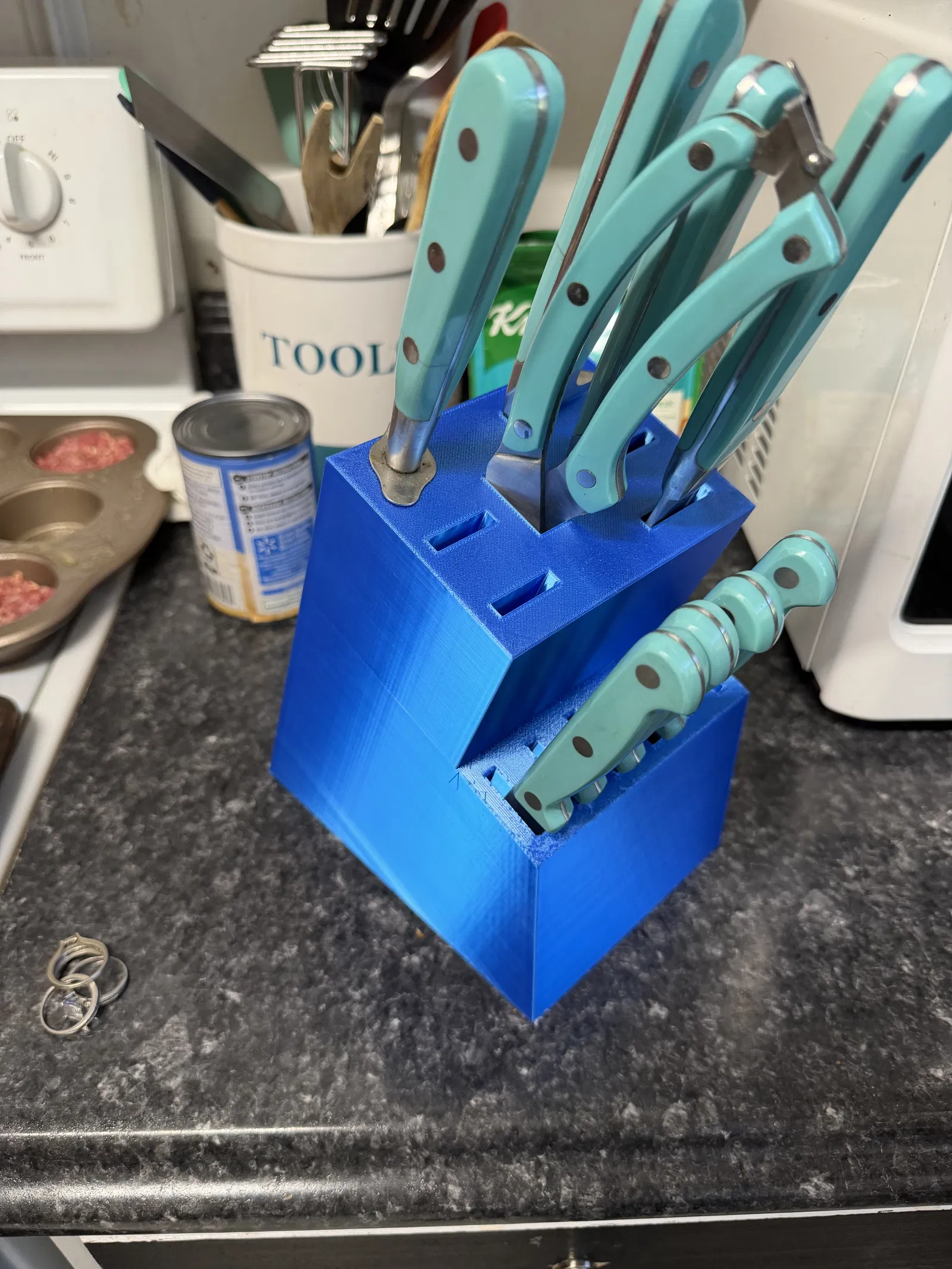 Bản remix kệ cắm dao Pioneer Woman 13 món tiện lợi hơn khi dùng nhựa Blue Silk PLA. Dễ dàng vệ sinh bằng nước ấm, không lo ẩm mốc như kệ gỗ truyền thống. Lưu ý cần cắt phần top block 30mm để bảo vệ mặt bàn bếp khỏi mũi dao sắc nhọn.