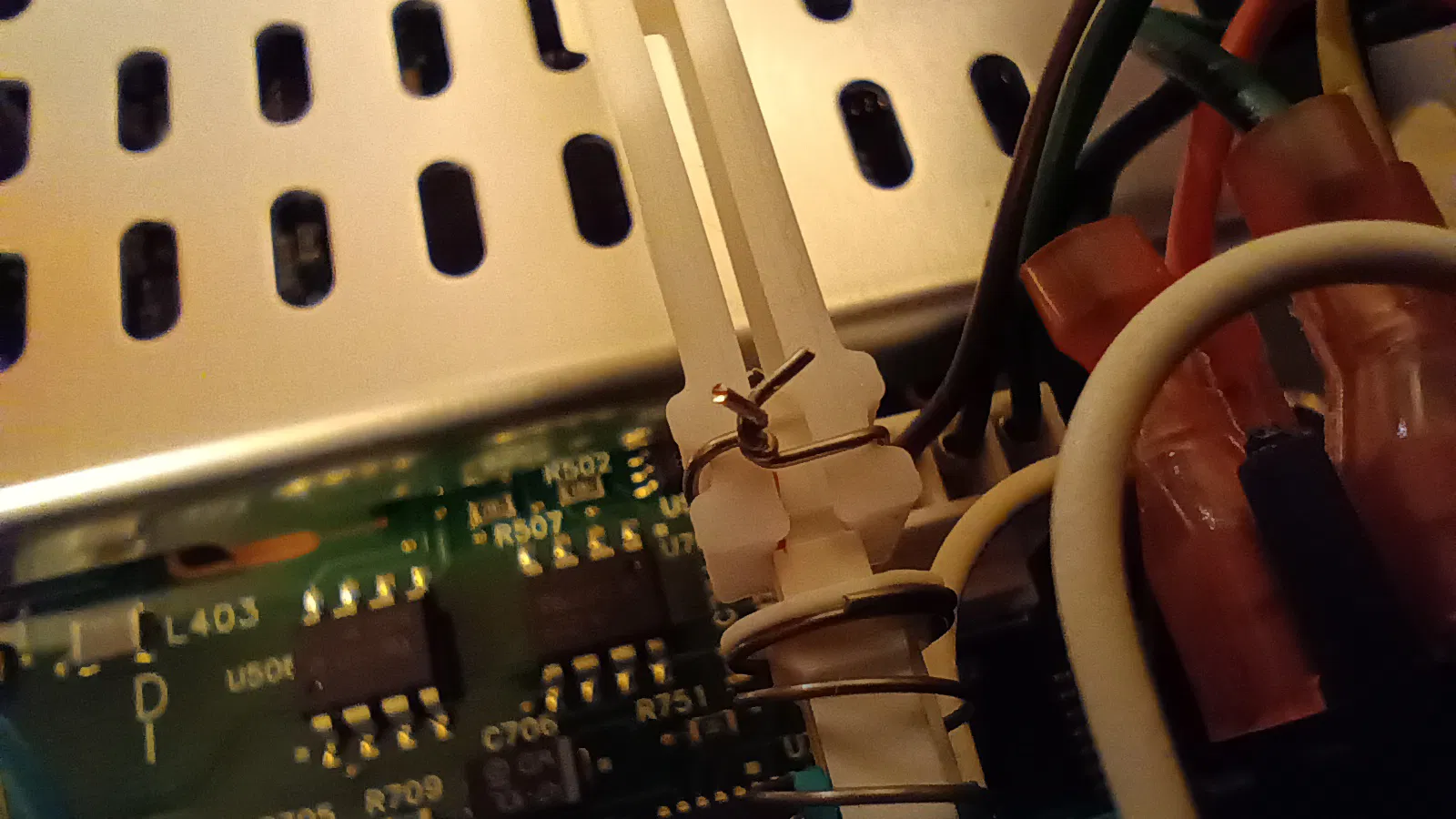 Sau khi lắp đầu của thanh phần 2 vào công tắc nguồn, bạn nhớ cố định mối nối bằng chỉ quấn hoặc làm như mình, dùng một đoạn dây kẽm nhỏ là chắc chắn.
