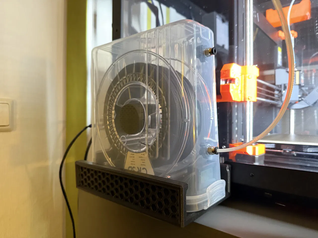 Cái kệ gắn bên hông này tương thích với Polydryer, DryBox của Extrutim và Sunlu S2. Khi sử dụng với Sunlu S2, bạn cần có cáp nguồn DC đầu cắm vuông góc.