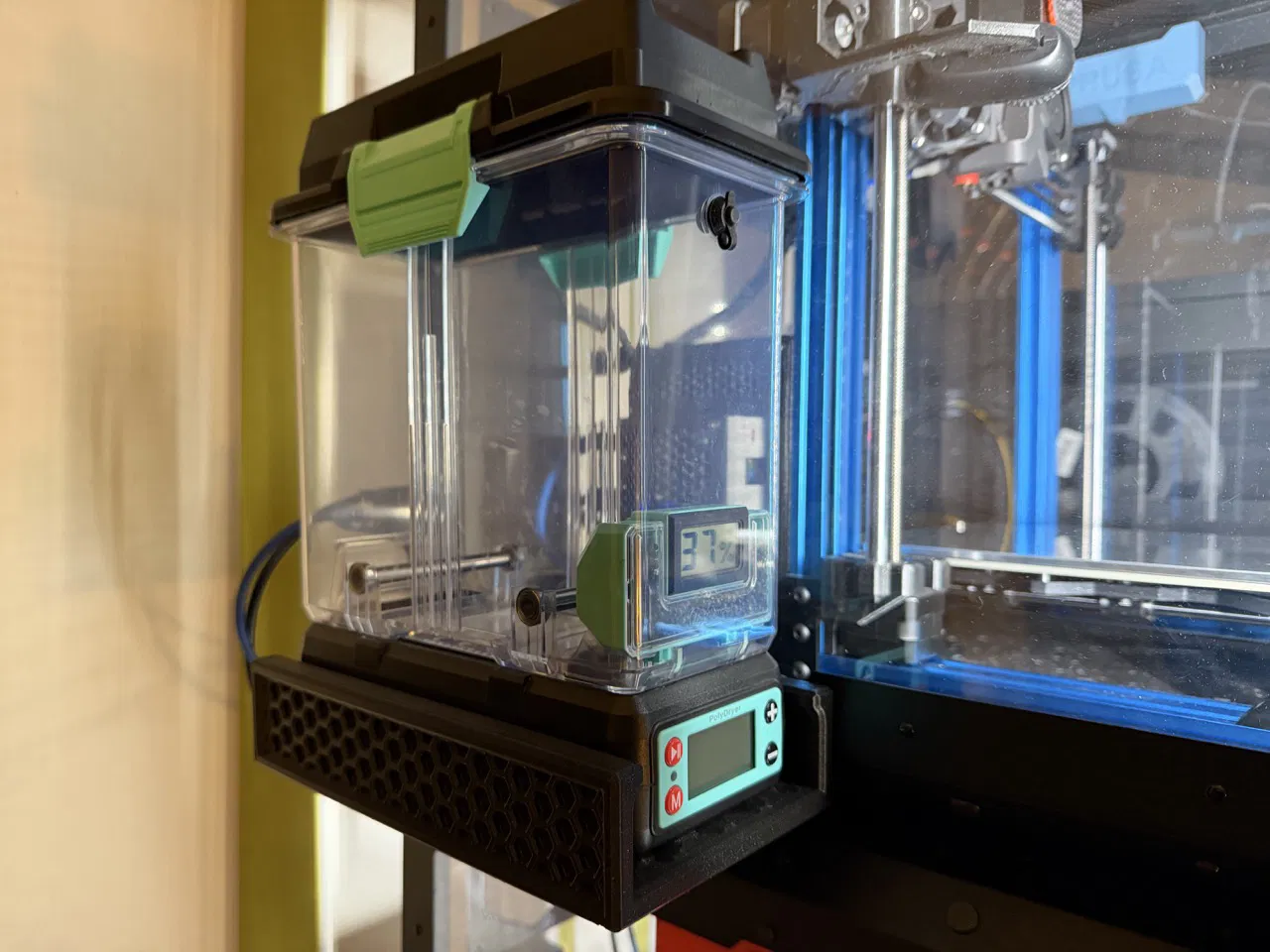 Giải pháp kệ treo hông giúp bạn lắp đặt các loại hộp sấy nhựa như Polydryer, Extrutim DryBox và Sunlu S2 ngay bên cạnh khung máy in Prusa. Thiết kế tiện lợi, tối ưu cho các thiết lập chồng tầng.