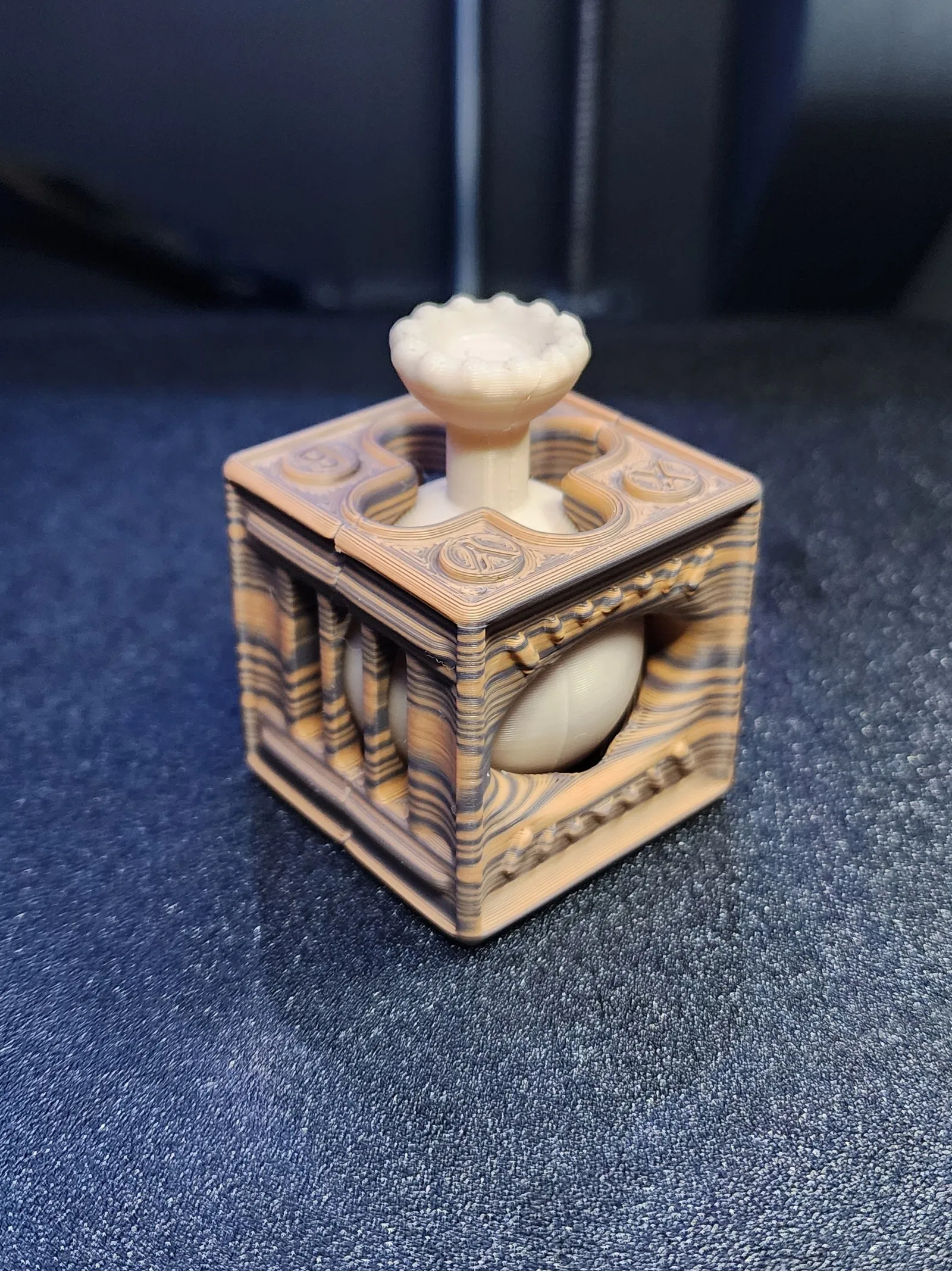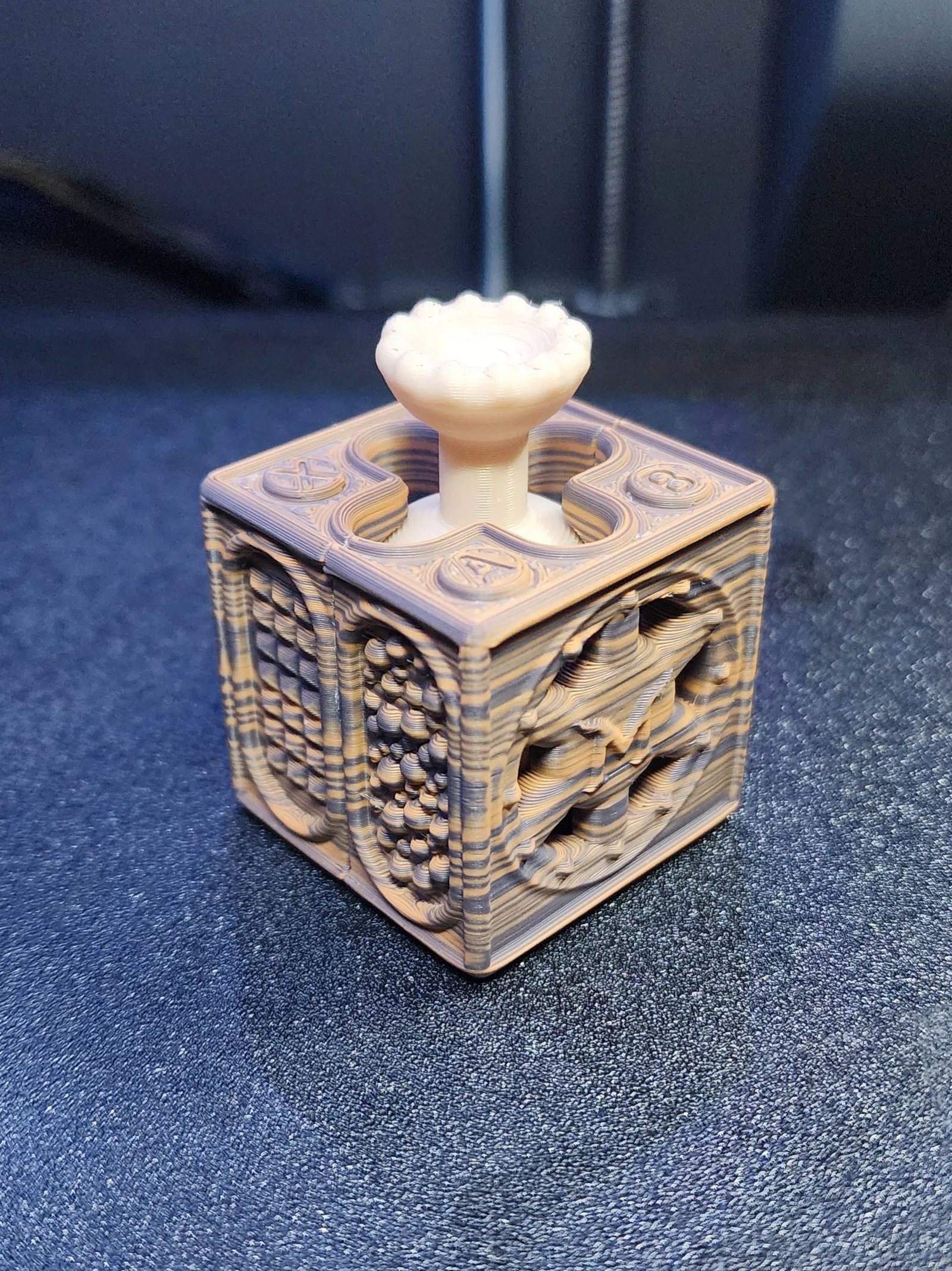 Đây là mẫu đồ chơi fidget in nguyên khối (print-in-place) và không cần hỗ trợ (support-free), được thiết kế với nhiều chi tiết cảm giác khác nhau trên một khối cube nhỏ gọn, rất dễ in. Mẫu này in khá nhanh và không cần support nếu máy in của bạn đã được cân chỉnh tốt, tuy nhiên hãy lưu ý là có một số bộ phận có độ nghiêng (overhang) lớn. Bạn cũng có thể dùng mẫu này như một vật phẩm kiểm tra độ chuẩn (calibration) cho máy in trước khi mang ra chơi!