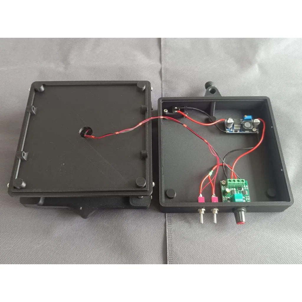 Có hai phiên bản: loại rộng 10cm và 15cm. Cả hai đều sử dụng mô-tơ rung (loại mô-tơ có tải lệch tâm). Mỗi phiên bản có hai mô-tơ, một đặt nằm ngang và một đặt thẳng đứng. Cách bố trí này giúp ngăn chặn sự hình thành sóng tĩnh và tối ưu hóa khả năng khuấy trộn. Các tấm này được thiết kế để giữ các cốc thí nghiệm (Becher) hoặc đĩa Petri thủy tinh tiêu chuẩn. Để truyền rung động cơ học vào dụng cụ thủy tinh, mình thiết kế kẹp với một phần giống dây cung in bằng TPU, điều chỉnh bằng vít M3 dài. Các bộ phận cứng và dẻo của kẹp được cố định với nhau bằng những đoạn nhựa in 3D nhỏ. Phần đế của tấm rung cũng bao gồm một giá đỡ cho chân đế thí nghiệm loại ống 8mm. Mình sẽ sớm ra mắt các file cho hệ thống giá đỡ thí nghiệm mô-đun mà mình đã thiết kế, và sẽ cập nhật đường link tại đây. Trước mắt, bạn có thể dùng bất kỳ loại giá thí nghiệm dựa trên ống 7-8mm nào.