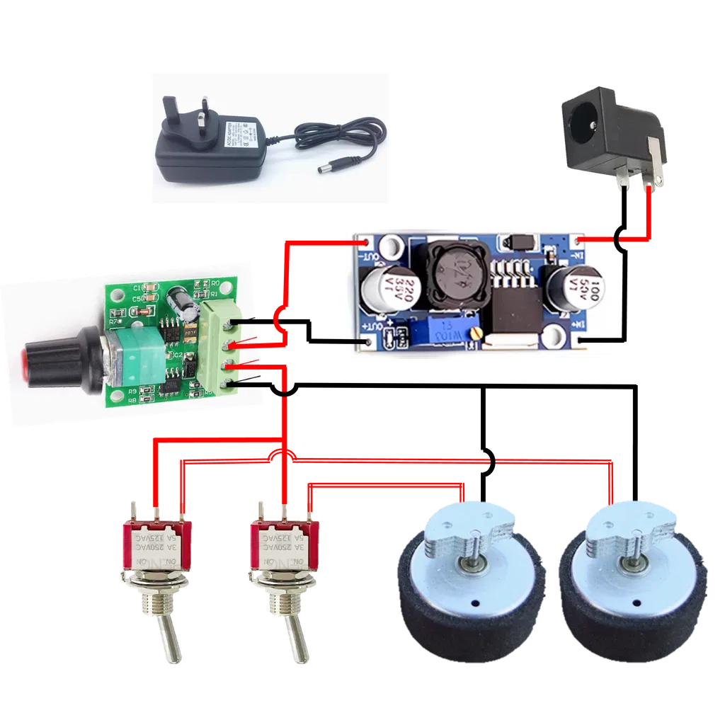 Các linh kiện điện tử này bạn có thể tìm mua ở các trang thương mại điện tử quen thuộc. Dưới đây là link tham khảo các linh kiện mình đã sử dụng (từ Taobao): Link mô-tơ 15cm, Link mô-tơ 10cm (0612)Link mô-tơ (1234), Nguồn điện, Bộ điều khiển tốc độ (1.8-12V 2A), Mạch hạ áp LM2596S, Công tắc.