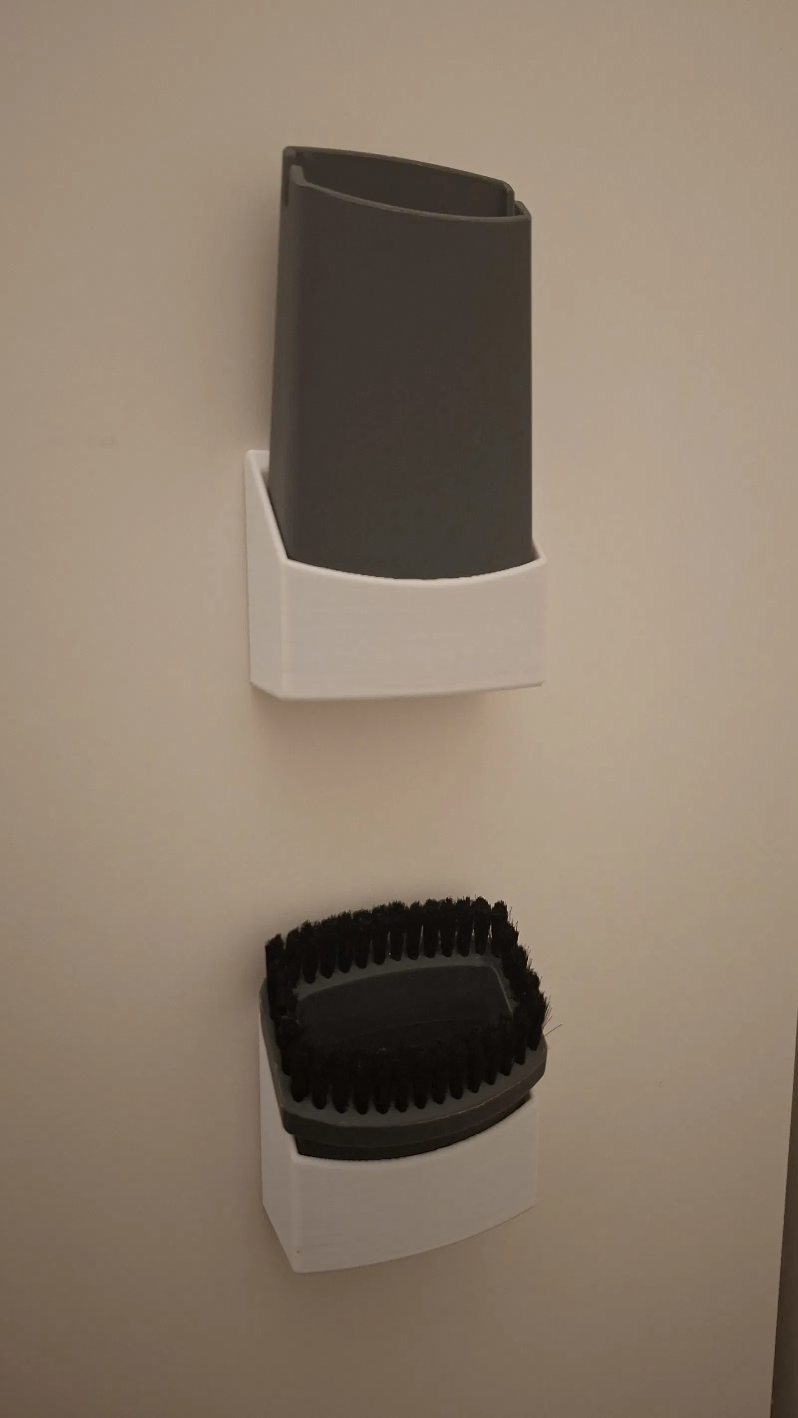 Việc lắp đặt cũng rất dễ dàng và nhanh chóng, không cần khoan tường hay làm hỏng bề mặt tủ. Bạn chỉ cần tận dụng các mặt phẳng như tường hoặc cạnh tủ, dán thêm băng dính xốp hai mặt (double-sided foam tape) vào các hốc ở phía sau giá là có thể cố định chúng ngay lập tức. Đây là một món phụ kiện 3D nhỏ gọn, thiết thực, mang lại sự ngăn nắp tuyệt vời cho gia đình bạn mỗi khi sử dụng máy hút bụi.