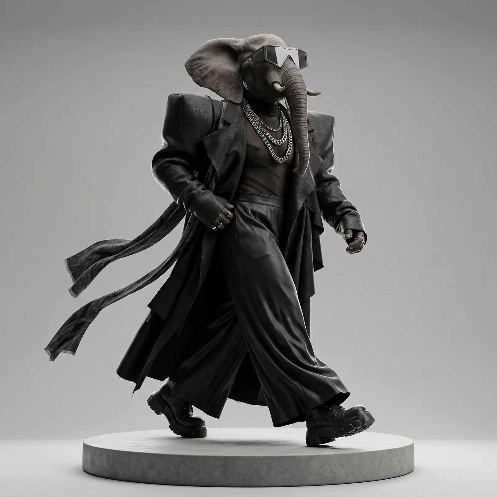 Một nhân vật voi nhân cách hóa đầy tinh tế được thiết kế để in 3D, khoác trên mình bộ trang phục thảm đỏ cực kỳ ấn tượng. Thiết kế này là sự kết hợp giữa vẻ quyến rũ thời thượng với tỷ lệ hoạt hình cách điệu đầy vui nhộn — một chú voi lịch lãm đang bước ra cho buổi công chiếu bom tấn. Ban đầu được lên ý tưởng với bộ suit sang trọng, nhân vật này đã phát triển qua phong cách runway avant-garde trước khi đạt đến hình thái cuối cùng: một biểu tượng thảm đỏ đẳng cấp với bộ lễ phục đen sang trọng. Mô hình có hình khối sắc nét, được tối ưu hóa cho in ấn cùng với phần đế thảm đỏ trang trí để tăng độ ổn định, biến nó trở thành một món đồ trưng bày nổi bật và một mô hình in 3D đáng tin cậy.