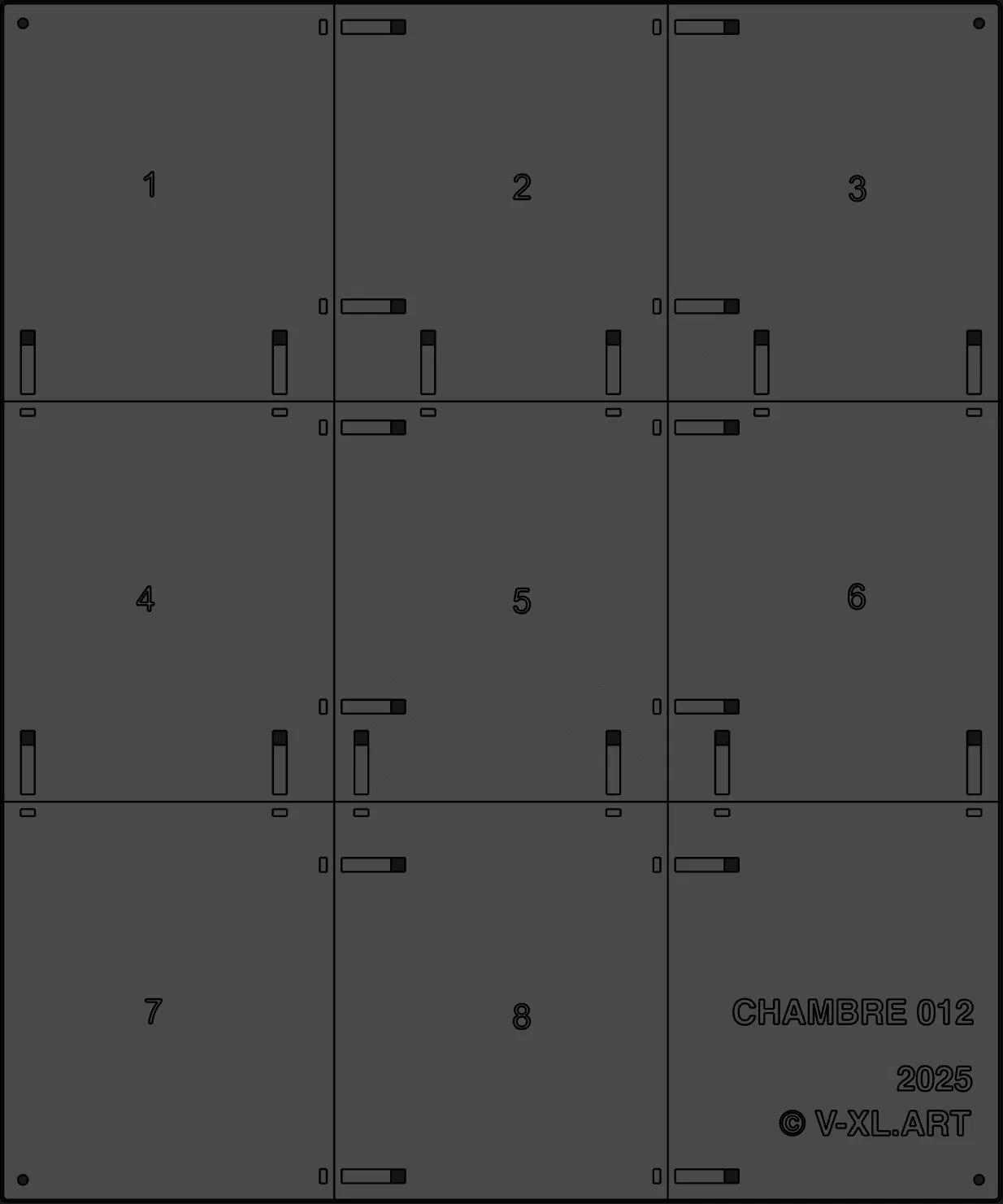 Dòng Open Chambre là bộ sưu tập các tác phẩm điêu khắc có thể in 3D, được nghệ sĩ V-XL (Baptiste Tavernier) làm việc tại Tokyo phát hành dưới dạng nghệ thuật mã nguồn mở. Trong khi kho lưu trữ Chambres chính bao gồm các tác phẩm vật lý độc bản, các mẫu Open Chambres này được chia sẻ tại đây để cộng đồng maker có thể tự tái tạo và thưởng thức. Nghệ sĩ: V-XL (Baptiste Tavernier) Kích thước: 49 x 41 x 6 cm; Tối ưu hóa cho in 3D FDM. * Máy in: Các linh kiện được thiết kế nhỏ gọn nên bạn hoàn toàn có thể in trên các dòng máy Mini nếu không có máy in kích thước tiêu chuẩn. Khám phá kho lưu trữ đầy đủ: Để xem các tác phẩm vật lý độc bản và tìm hiểu thêm về dự án này, hãy ghé thăm trang chủ: https://v-xl.art **** 🛠 QUY TRÌNH IN Thẩm mỹ: Tối ưu hóa cho mọi loại vật liệu. Phối màu tiêu chuẩn: Khung màu đen với các điểm nhấn màu nổi bật, chi tiết trung tâm màu trắng. Phần cứng: Tất cả các mô-đun của V-XL đều sử dụng ốc vít M3 x 8mm và đai ốc vuông M3 (5.5 x 5.5 x 2.6mm) để lắp ráp. * Thông số kỹ thuật: Khuyến nghị sử dụng đầu phun 0.4mm. Nên dùng brim để đảm bảo độ chắc chắn và chống cong vênh khi in phần đế. Mô-đun này được chia thành nhiều tệp. — Đầu tiên, in 9 tệp "Base" (phần đế) (Phối màu tiêu chuẩn: đen). Không cần dùng support, nhưng nên dùng brim để cố định đế trên bàn in. Sau đó lắp ráp chúng lại bằng vít và đai ốc. — Tiếp theo, in 16 tệp "Specimen" (phần mẫu vật) (Phối màu tiêu chuẩn: trắng). Dán chúng lên phần đế tương ứng với các số đã đánh dấu. — Sau đó in 14 chi tiết "Line" (Phối màu tiêu chuẩn: xanh dương) và dán chúng lên đế. Cuối cùng, hoàn thiện bằng cách gắn các miếng inlay "Square" (x2) và "Rune". ————— © V-XL // Baptiste Tavernier