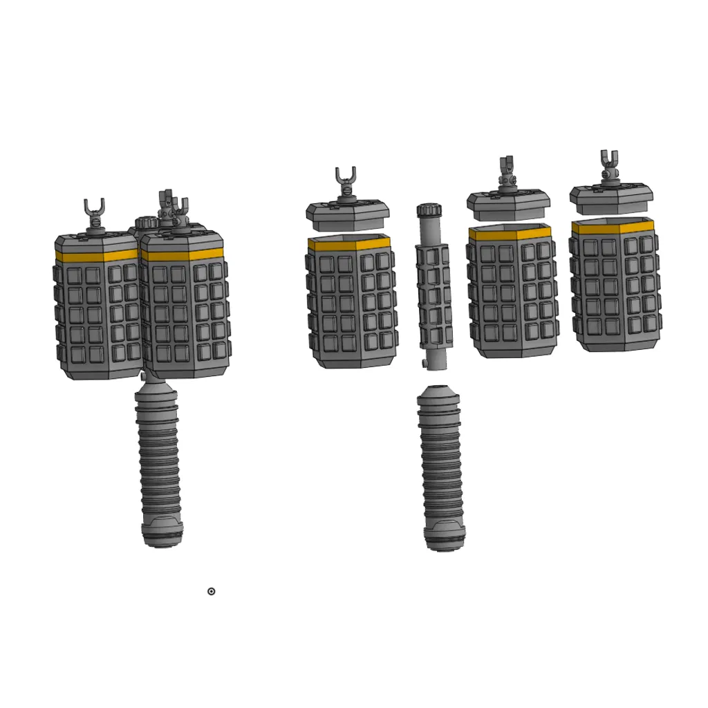 Thiết kế của mô hình này khá thông minh với cấu trúc tách rời, cho phép bạn in từng phần riêng lẻ rồi lắp ráp lại với nhau. Điểm thú vị là phần tay cầm được thiết kế để kết nối với một thanh gỗ tròn (dowel) có kích thước 1/2 inch, giúp tăng độ cứng cáp và chân thực cho toàn bộ cấu trúc. Bạn cũng có thể sử dụng các phần lựu đạn rời như những hộp chứa đồ nhỏ, tạo thêm sự đa năng và tiện dụng cho món đồ của mình.
