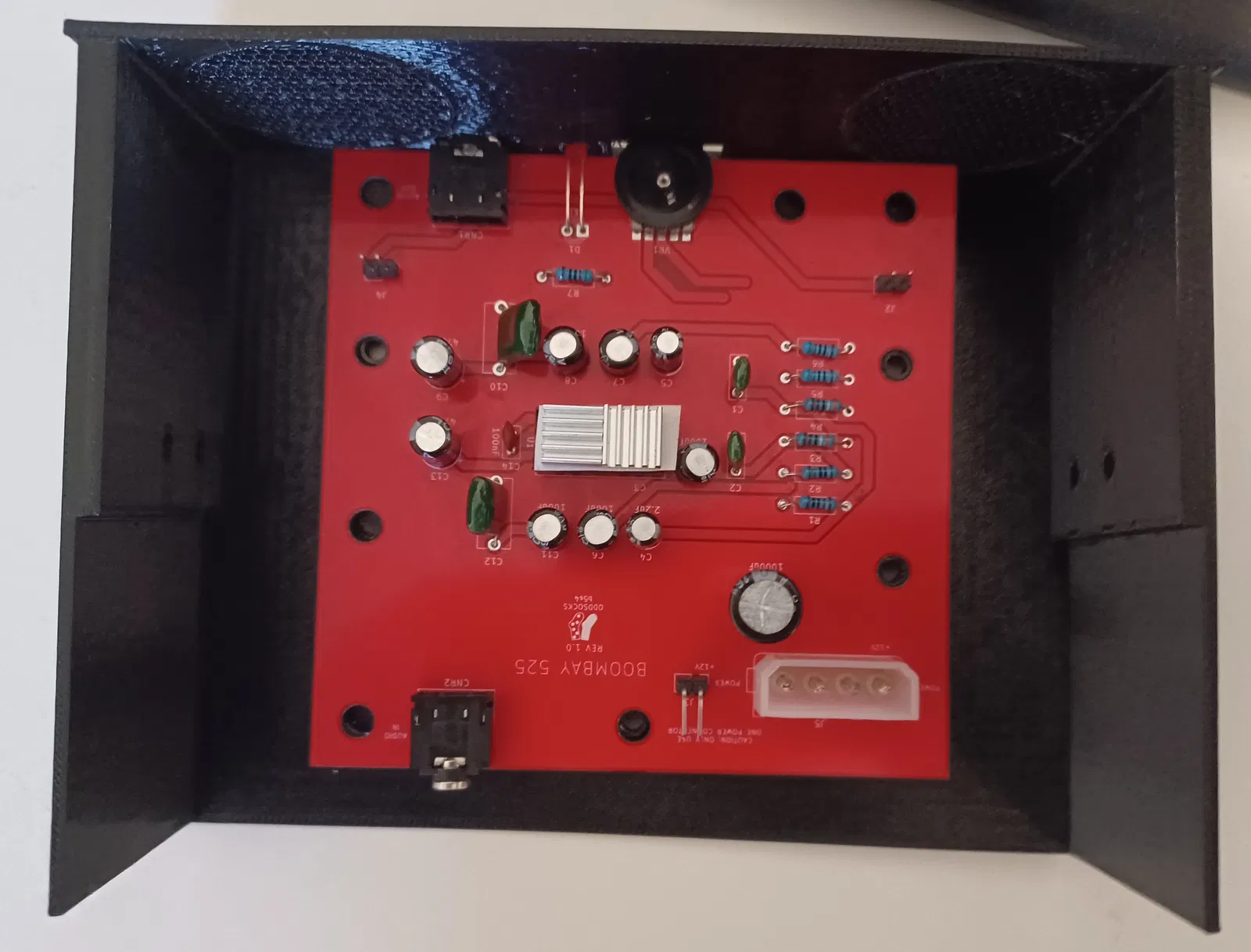 Đây là phần vỏ case cho dự án BoomBay 525. BoomBay là một bộ khuếch đại âm thanh stereo dạng PCB, cho phép gắn loa vào ngay khay ổ đĩa 5.25 inch. Thiết bị này tích hợp sẵn núm vặn âm lượng, đèn LED báo nguồn và một jack cắm tai nghe đầu ra. BoomBay lấy nguồn trực tiếp từ bộ nguồn (PSU) của máy tính và nhận tín hiệu âm thanh từ card âm thanh của bạn. Mặc dù được thiết kế chủ yếu cho các dàn máy tính cổ (retro-computer), nhưng bạn hoàn toàn có thể dùng cho nhiều mục đích khác.