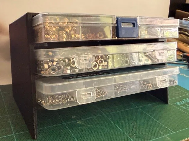 Nếu bạn là một người yêu thích chế tạo, sửa chữa điện tử hoặc đơn giản là một "thợ máy tại gia" chính hiệu, chắc chắn bạn sẽ hiểu cảm giác đau đầu khi nhìn đống ốc vít, bu-lông, đai ốc hay các loại hạt cấy (heat-set inserts) nằm vương vãi khắp nơi. Mẫu thiết kế này là giải pháp cực kỳ gọn gàng để sắp xếp lại bàn làm việc của bạn. Thay vì để các hộp đựng linh kiện chồng chéo lên nhau một cách lộn xộn, bộ kệ 3 tầng này cho phép bạn đặt các hộp nhựa tiêu chuẩn vào những ngăn kéo tự chế, giúp việc lấy đồ trở nên nhanh chóng và khoa học hơn rất nhiều.