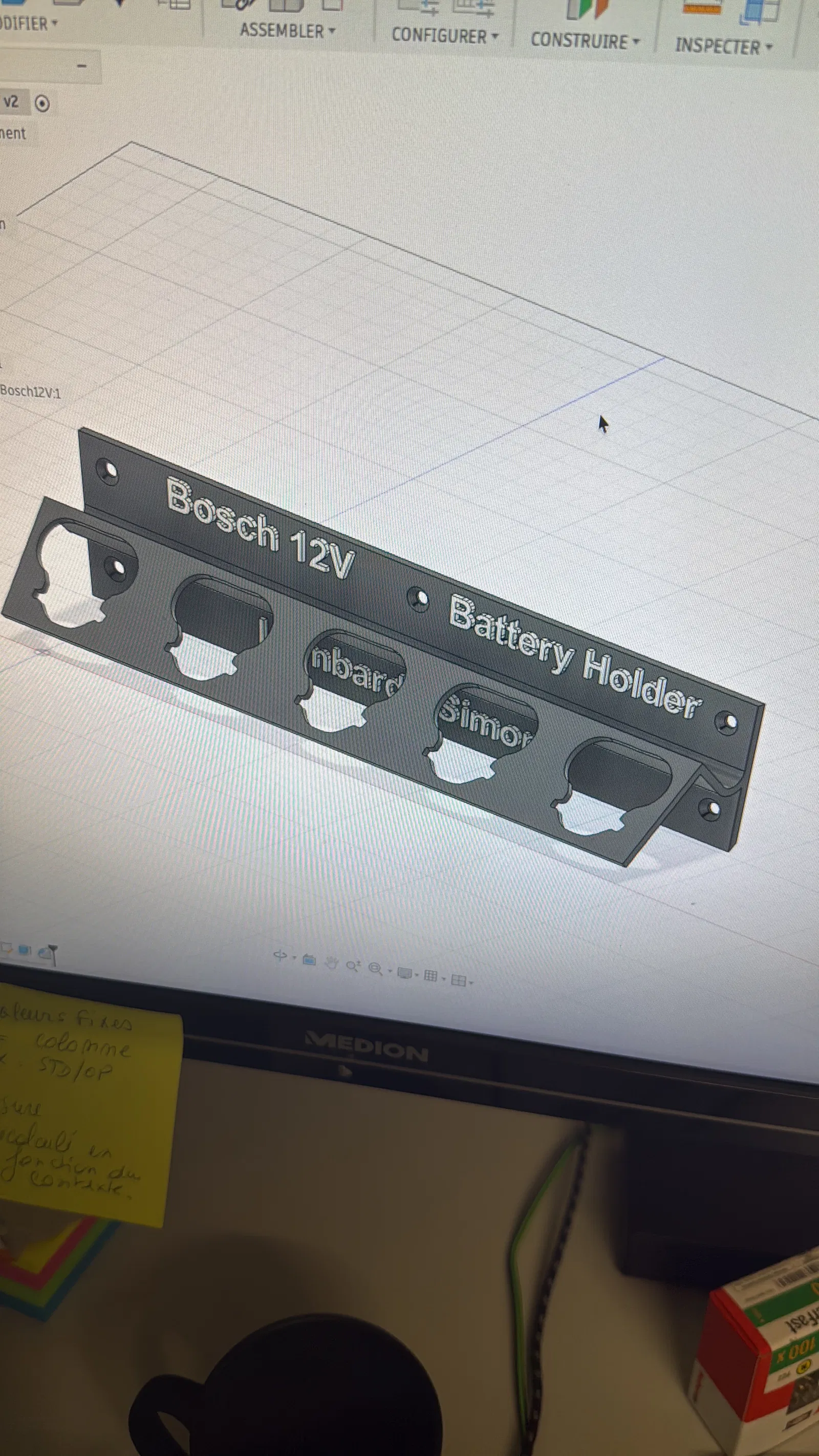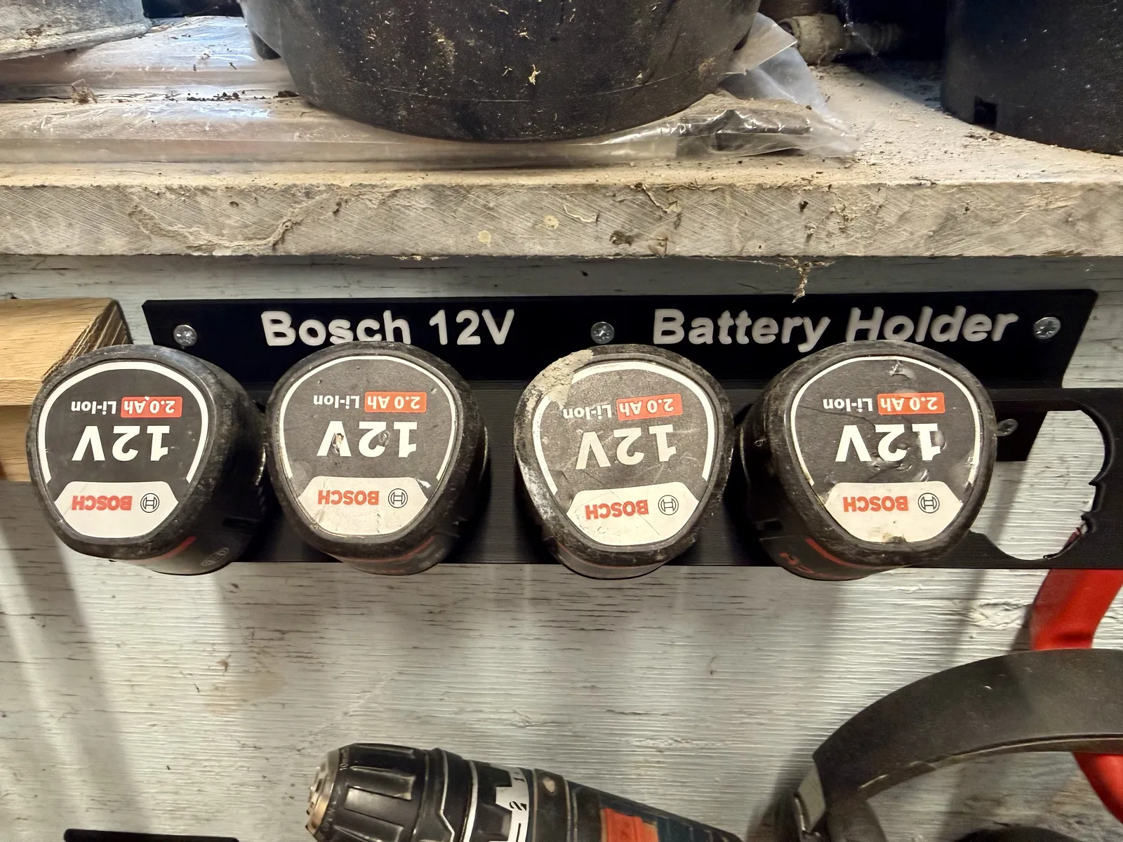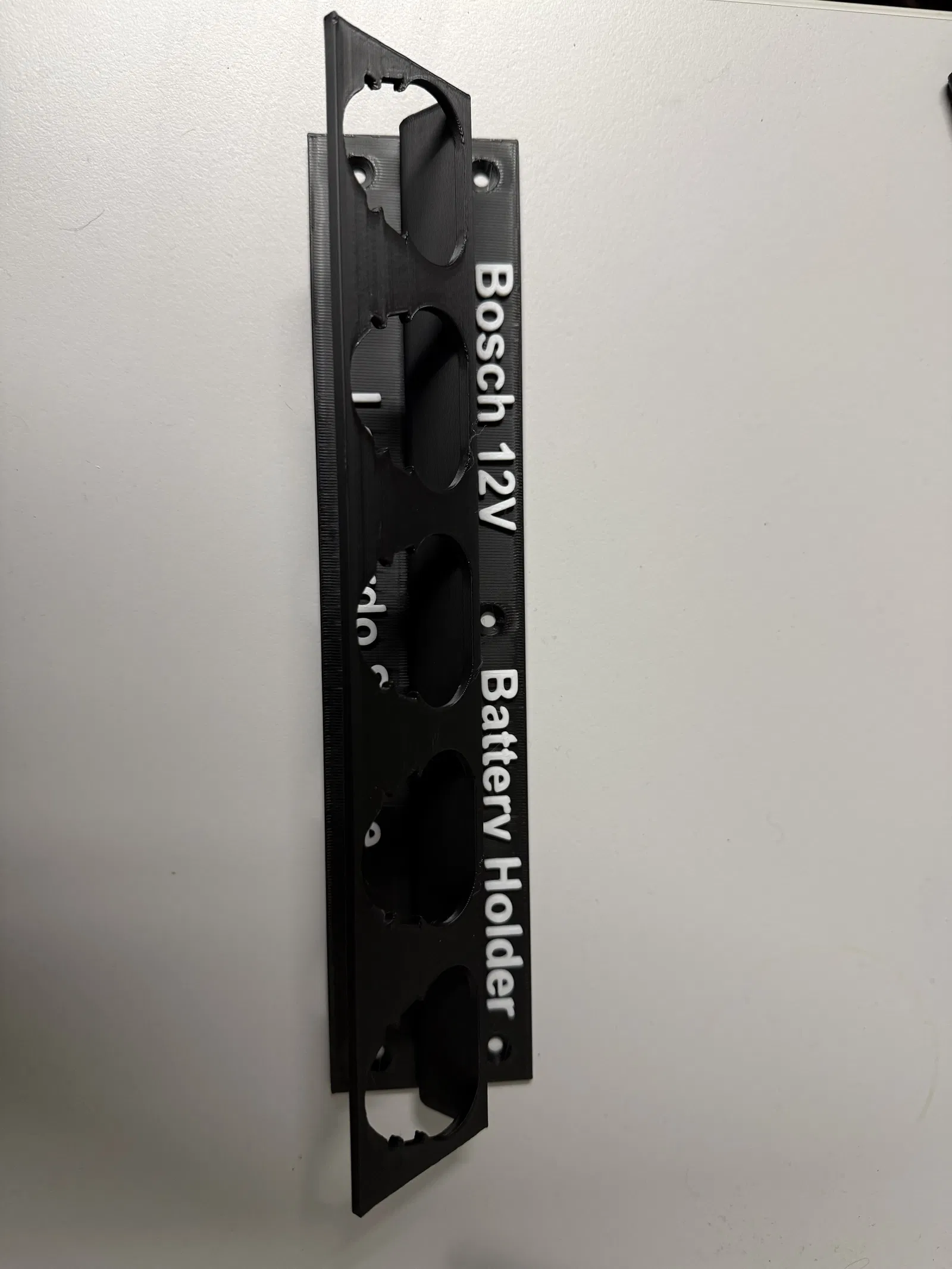Giá treo tường cho 5 viên pin Bosch Pro 12V/10,8V. Các phần chữ được tách riêng thành một đối tượng riêng biệt trong file, anh em có thể tùy chọn in hay không.