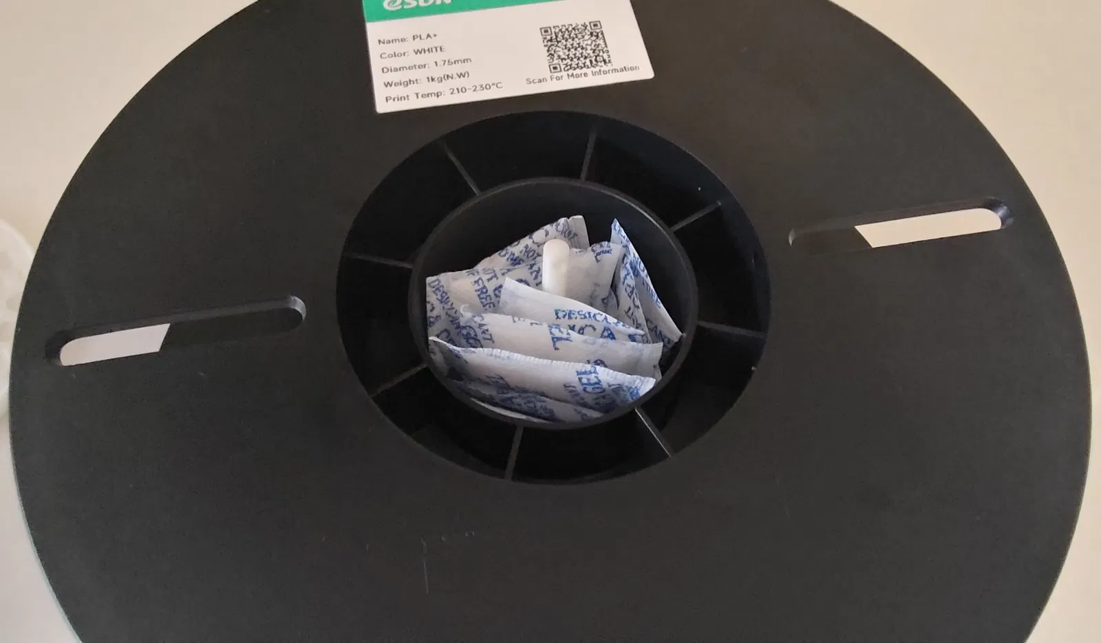 Thiết kế này cũng không có gì phức tạp. Bạn chỉ cần in hai chiếc đĩa và một bộ chốt. Đặt một đĩa vào bên trong cuộn nhựa, cắm chốt vào đó, sau đó cho các túi hút ẩm nhỏ vào tâm cuộn, đặt đĩa còn lại vào phía bên kia để đậy kín các túi hút ẩm, rồi dùng kẹp chốt để ép chặt hai đĩa lại với nhau giúp chúng không bị rơi ra ngoài.