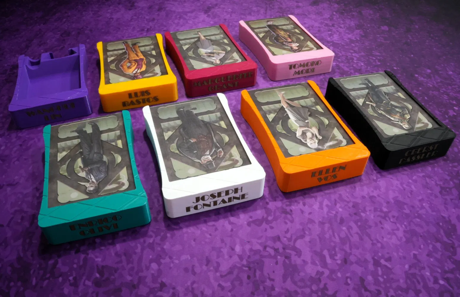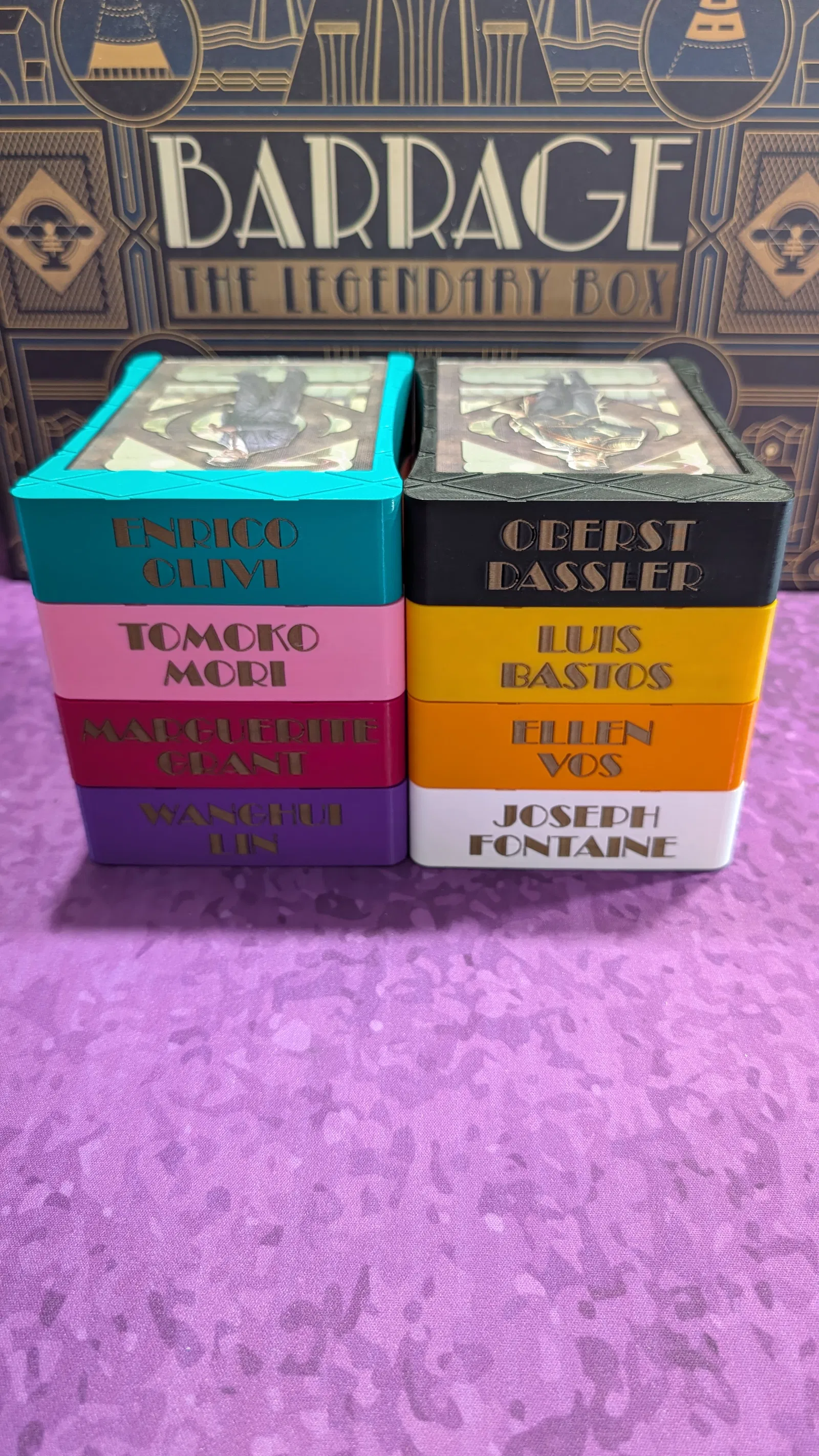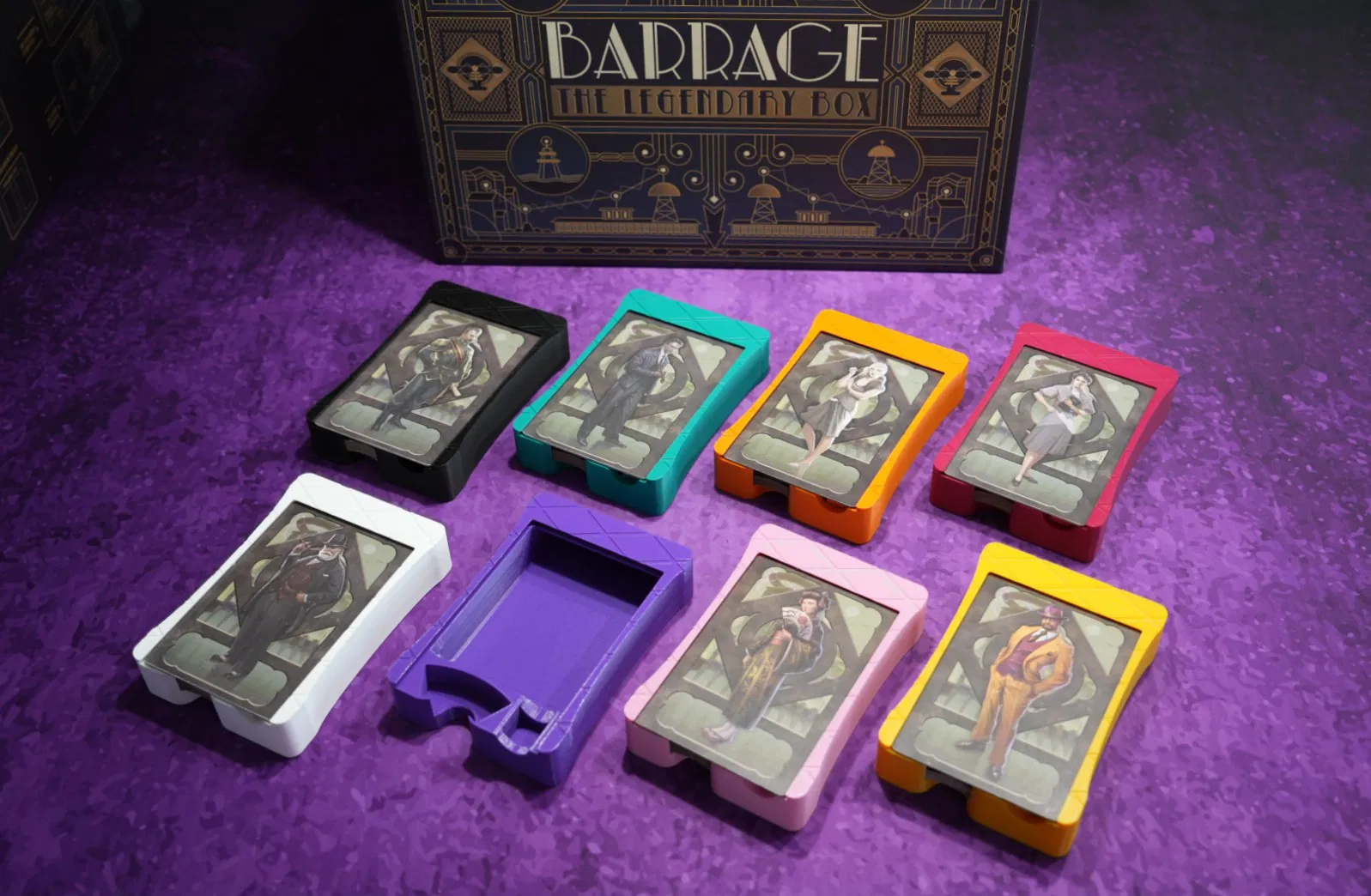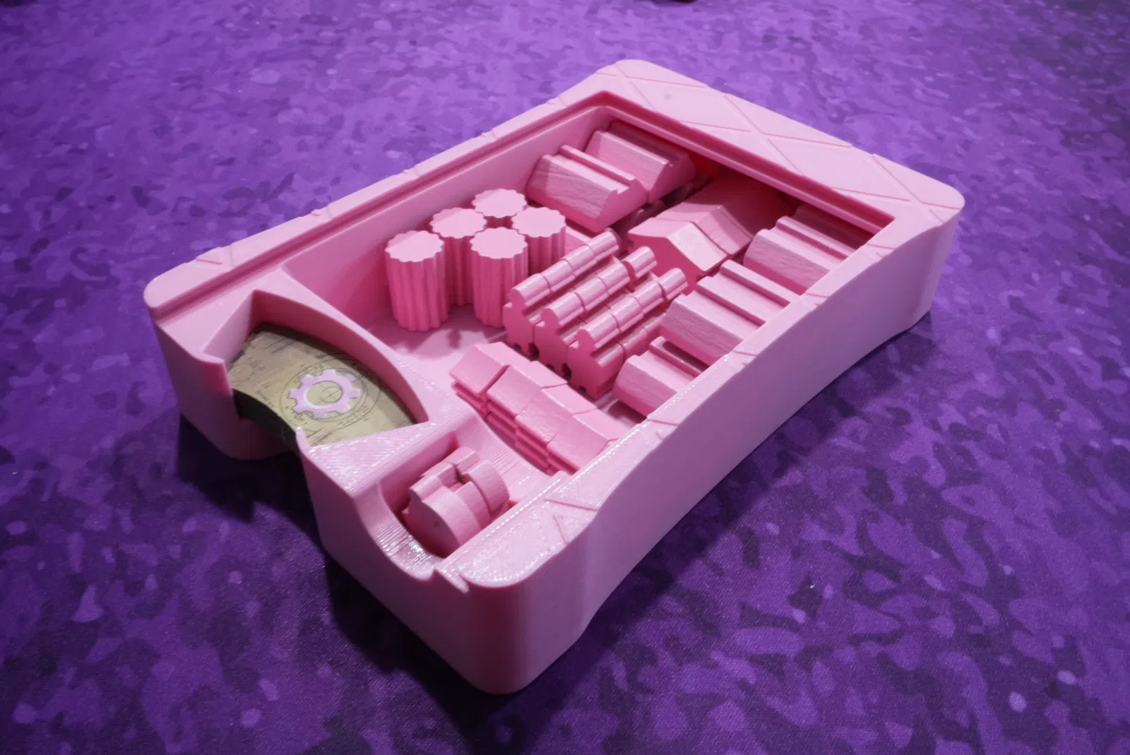 Mẫu này là phiên bản nâng cấp từ khay đựng công ty (company trays) trong game Barrage của mình. Các thẻ công ty một lần nữa được sử dụng làm nắp đậy khay, và mình đã mô phỏng thiết kế đường nét tối giản dựa trên nắp nhựa của bộ insert gốc.