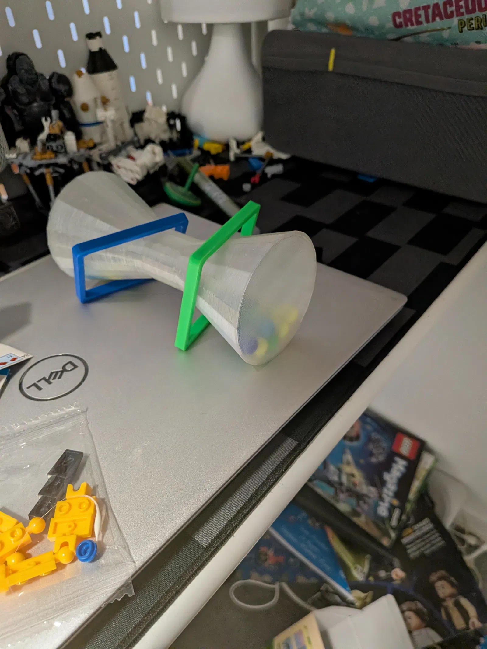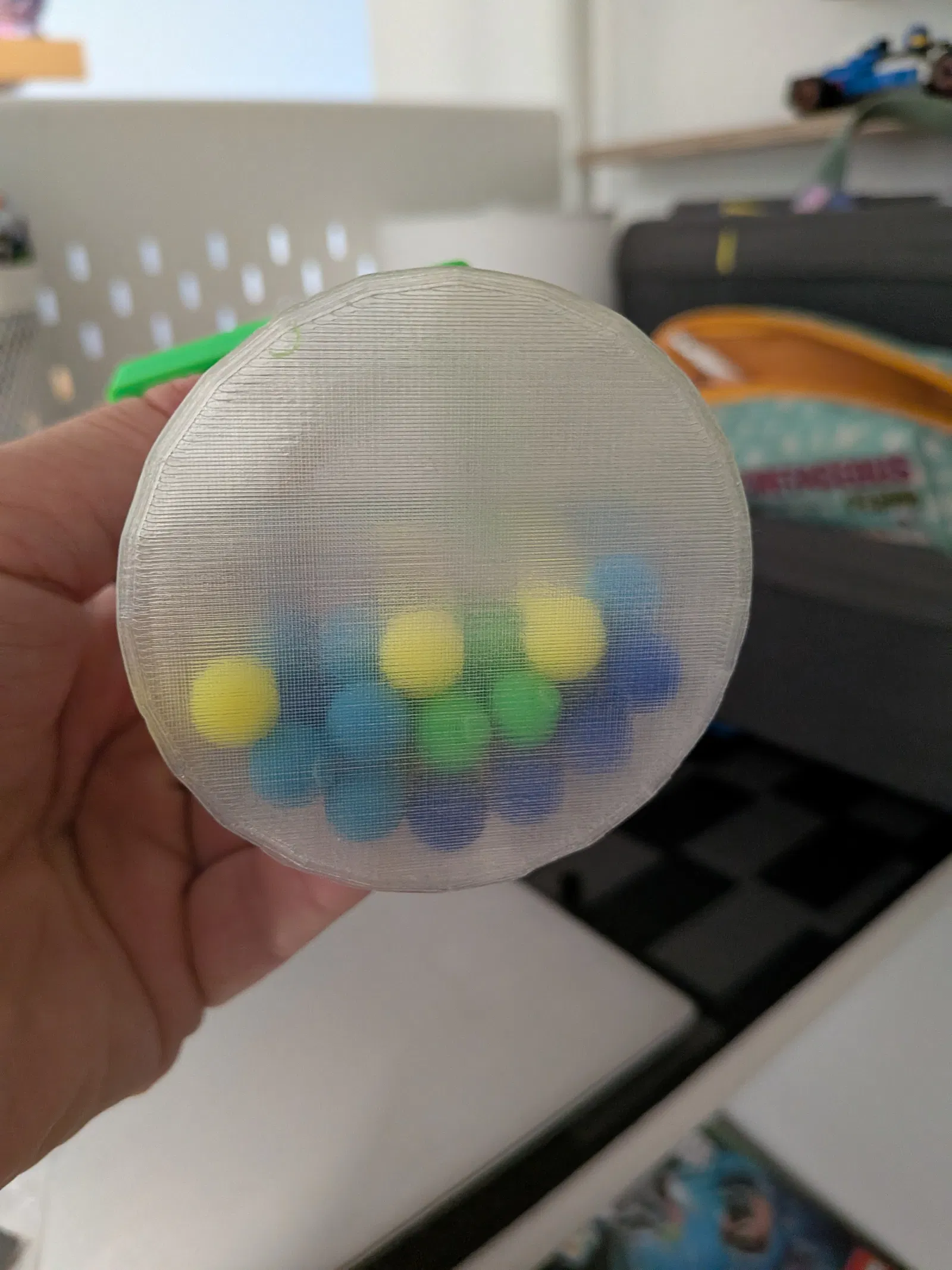 Chúng mình đã in phần thân ngoài bằng nhựa PLA trong để có thể nhìn thấy các viên bi bên trong. Nếu muốn tăng cảm giác tay, bạn có thể thiết lập in bề mặt ngoài dạng 'fuzzy' (nhám). Ngoài ra, bạn có thể dùng số lớp in khác nhau cho mặt trên và mặt dưới để tạo ra âm thanh khác biệt khi gõ vào hai mặt này.