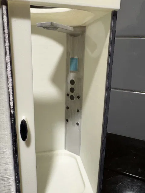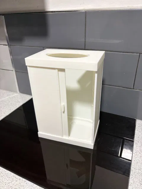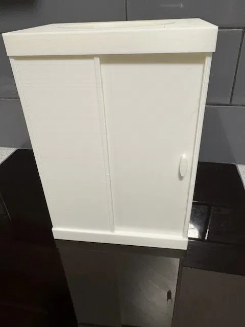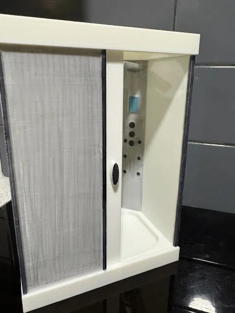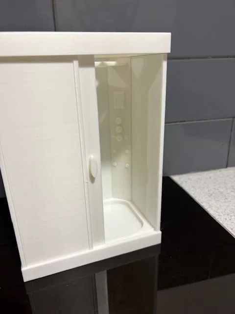 Một sự bổ sung tuyệt vời cho bộ sưu tập nhà búp bê của bạn. Buồng tắm đứng hiện đại này đi kèm với cửa lùa và mô-đun vòi sen tích hợp vòi phun trên cao, tia mát-xa cơ thể và màn hình hiển thị. 4 tấm in của mình ban đầu là màu trắng hoàn toàn nhưng cháu gái mình đã quyết định tô thêm màu sắc. Kết quả ra rất ổn. Nếu bạn có hoa tay về hội họa, bạn hoàn toàn có thể biến buồng tắm này thành một tác phẩm nghệ thuật. Hướng dẫn lắp ráp: dán mô-đun vào góc phía sau bên phải. Đặt cửa vào rãnh dưới. Dán phần mái lên sao cho cửa khớp vào rãnh trên mái. Bạn có thể thay đổi tỉ lệ (scale) tùy theo mục đích sử dụng. Thiết lập khuyến nghị: Layer 0.20, 2 Walls, Infill 15%.