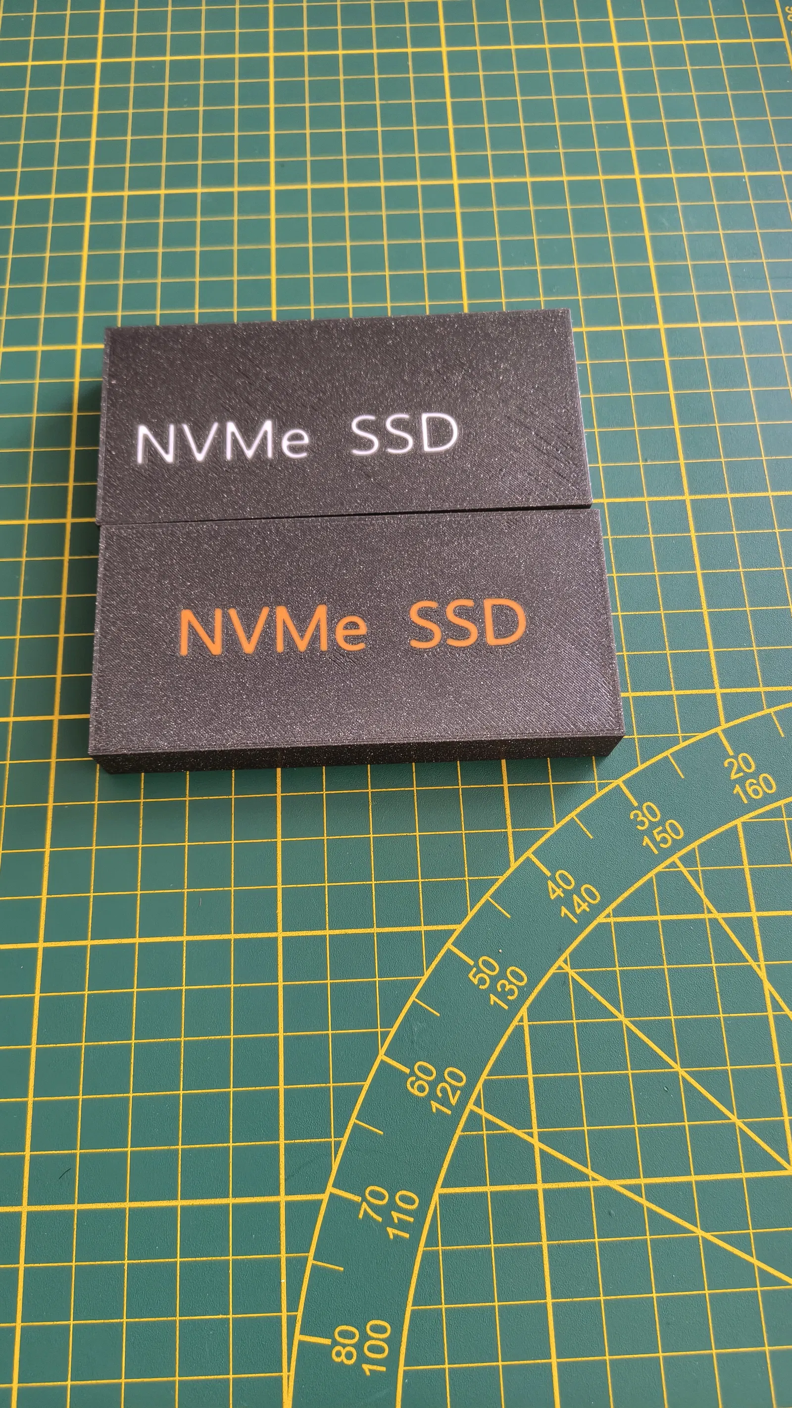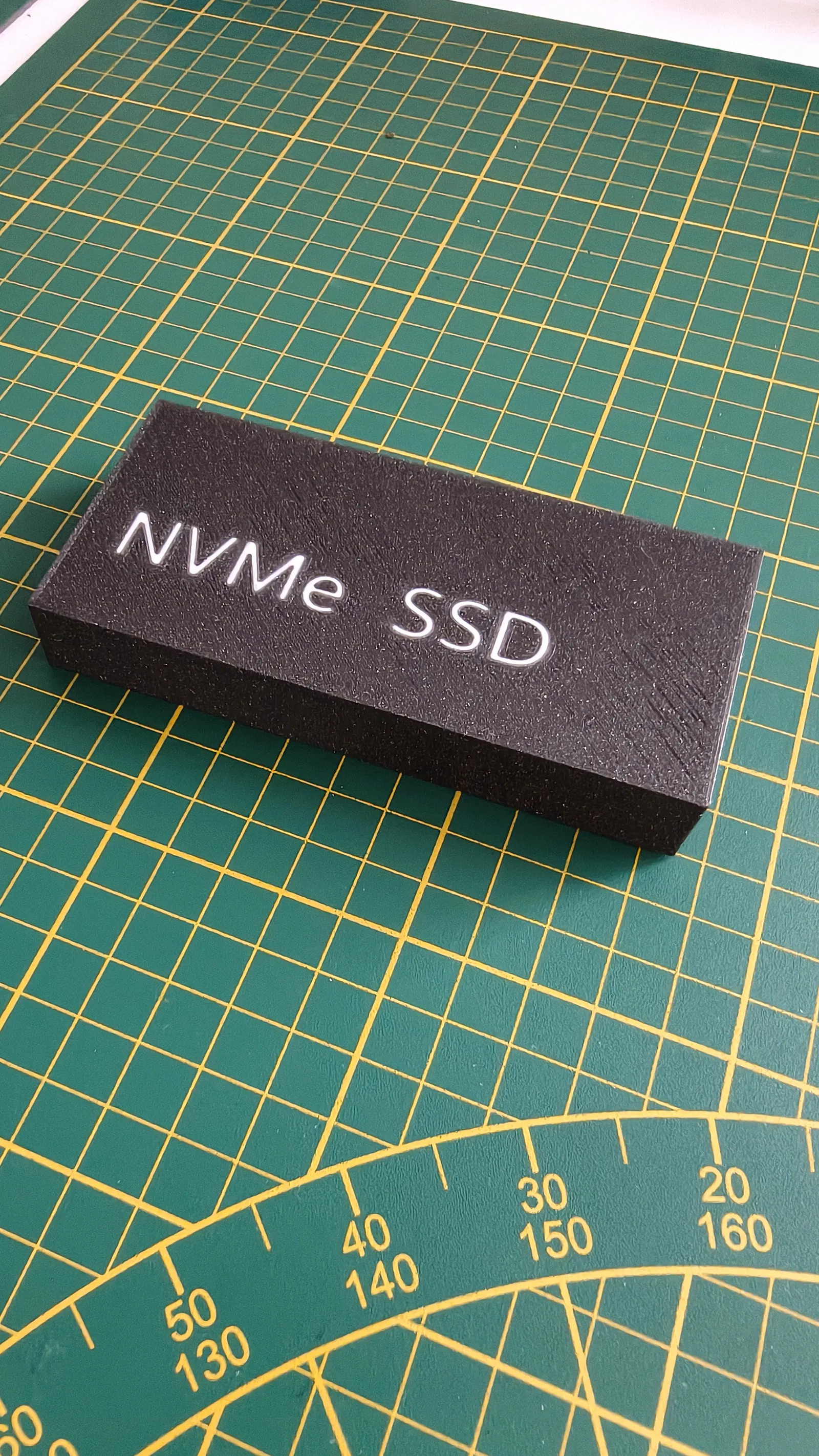 Thiết kế của nắp bảo vệ rất tối giản nhưng hiệu quả, với chữ "NVMe SSD" được in nổi bật trên bề mặt giúp anh em dễ dàng nhận diện ổ cứng nhanh chóng. Bạn có thể tận dụng kỹ thuật in 3D đổi màu (filament swap) để làm cho dòng chữ nổi bật hơn, giúp tăng tính thẩm mỹ và cá nhân hóa thiết bị của mình. Đây là một giải pháp tự chế (DIY) cực kỳ hữu ích cho những ai đang tìm kiếm một phụ kiện bảo vệ chi phí thấp nhưng đạt hiệu quả cao.