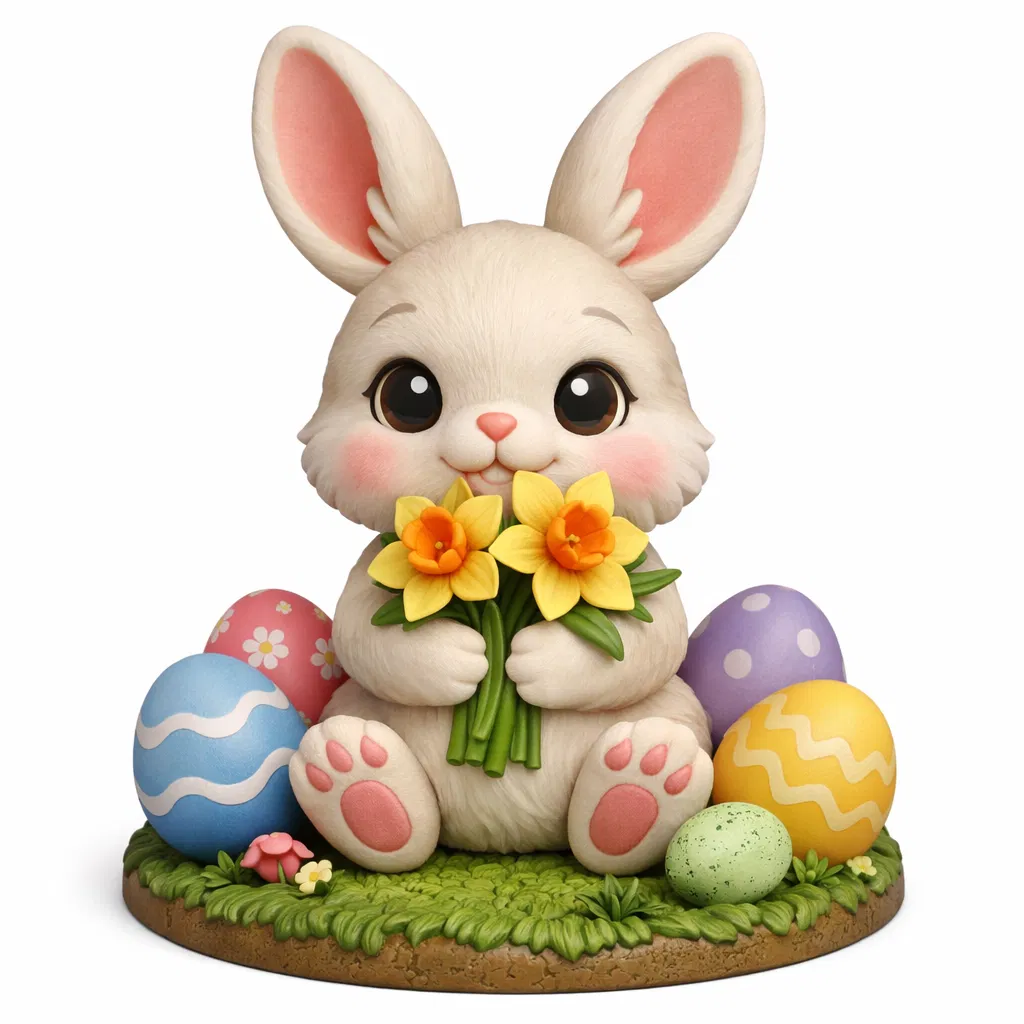 Mùa lễ Phục sinh này, bạn đang tìm kiếm một món đồ trang trí nhỏ nhắn, đáng yêu để tô điểm cho không gian sống? Mô hình chú thỏ Phục sinh (Easter Bunny) ôm hoa thủy tiên cùng những quả trứng đầy màu sắc chính là lựa chọn tuyệt vời dành cho bạn. Được thiết kế với những đường nét mềm mại và gương mặt biểu cảm, chú thỏ này không chỉ là một sản phẩm 3D thông thường mà còn là một tác phẩm nghệ thuật mini giúp mang không khí tươi vui, ấm áp vào căn phòng của bạn. Đây là món quà tinh thần thú vị cho các bé hoặc dùng để decor bàn làm việc, kệ sách đều rất hợp lý.