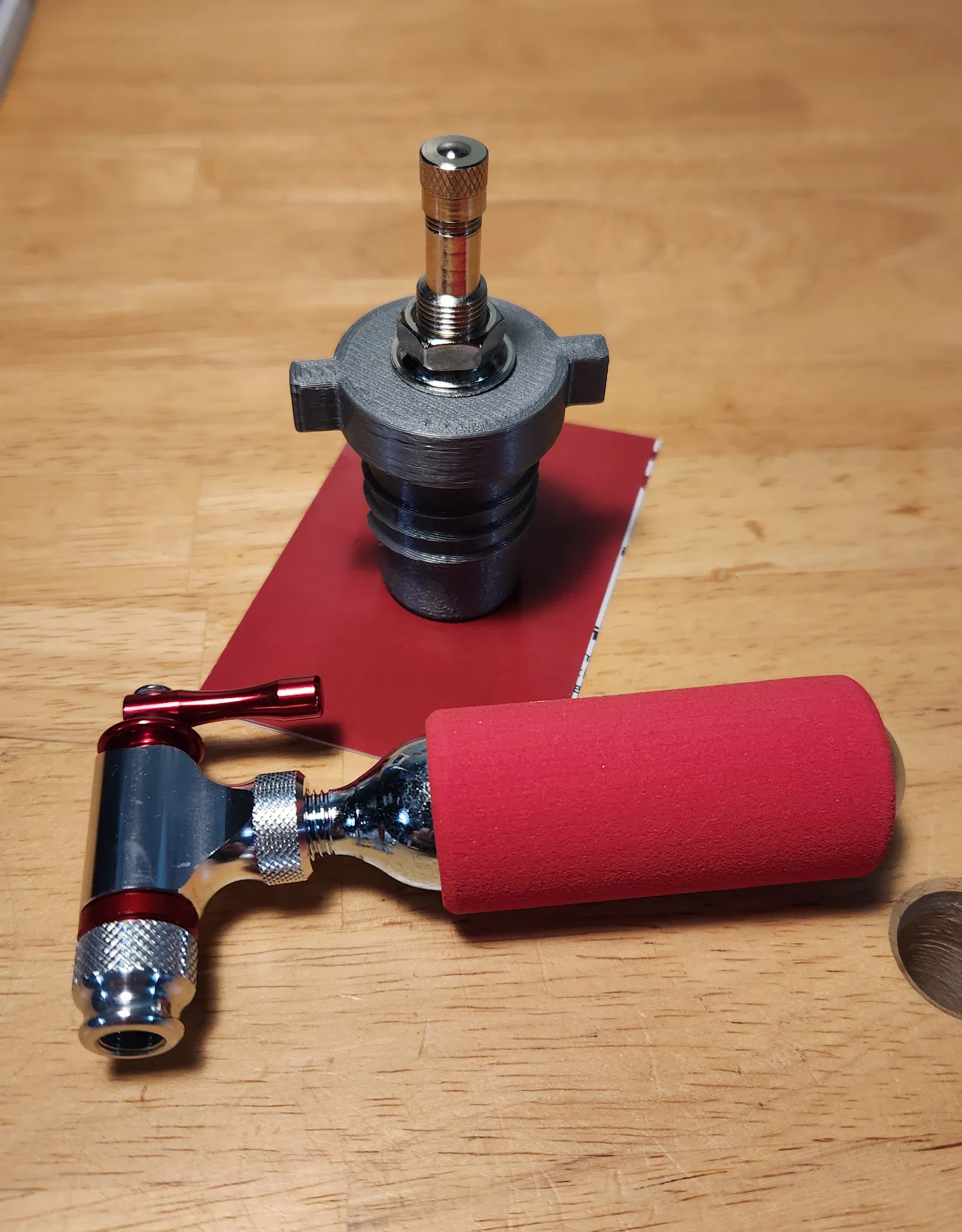 Tôi đã chỉnh sửa thiết kế để dùng van Schrader (cụ thể cho lỗ có đường kính .453") thay vì dùng ball lock. Tôi sử dụng chân van kim loại MSUHETTU TR416.