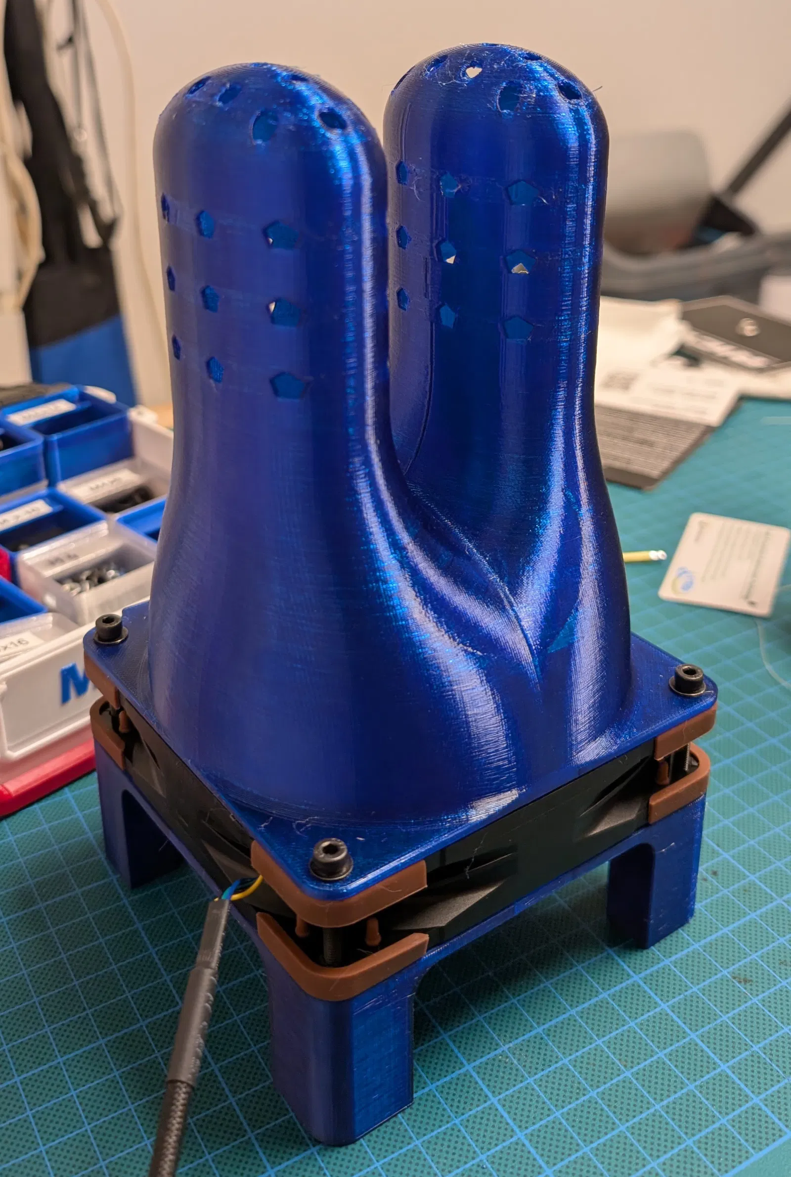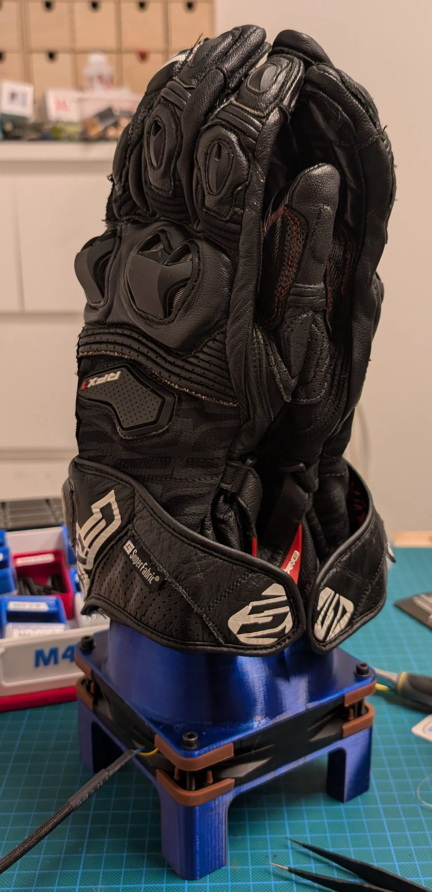 Thiết bị in 3D giúp làm khô găng tay mô tô nhanh chóng ngay tại đường đua. Sử dụng quạt Noctua NF-F12 PPC với kết cấu chắc chắn từ nhựa PETG, đảm bảo găng tay luôn khô ráo cho những chặng đua tiếp theo.