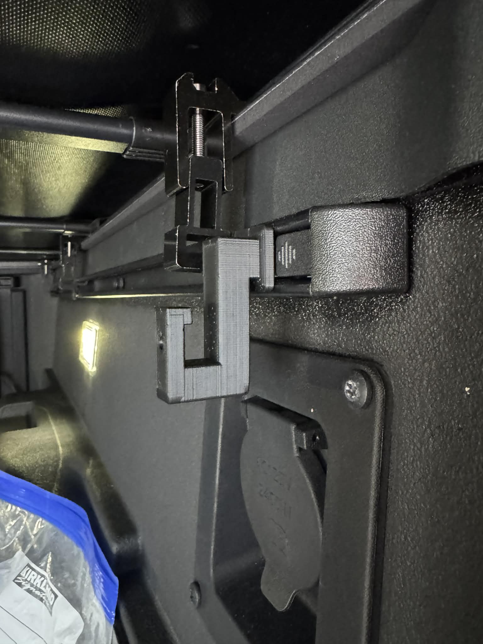 Mình thiết kế chiếc móc này để giúp việc treo túi đồ tạp hóa trên thùng xe tải trở nên dễ dàng hơn, giúp chúng không bị xê dịch lung tung. Bạn cũng có thể dùng nó để móc bất cứ thứ gì và giữ chúng cố định tại chỗ. Các móc này có thể trượt dọc thanh ray với một chút lực cản, nhưng khi đã vào vị trí thì bạn chỉ cần dùng một lực nhỏ là đẩy được. Mình cố tình thiết kế như vậy để tránh cho móc bị di chuyển không cần thiết.