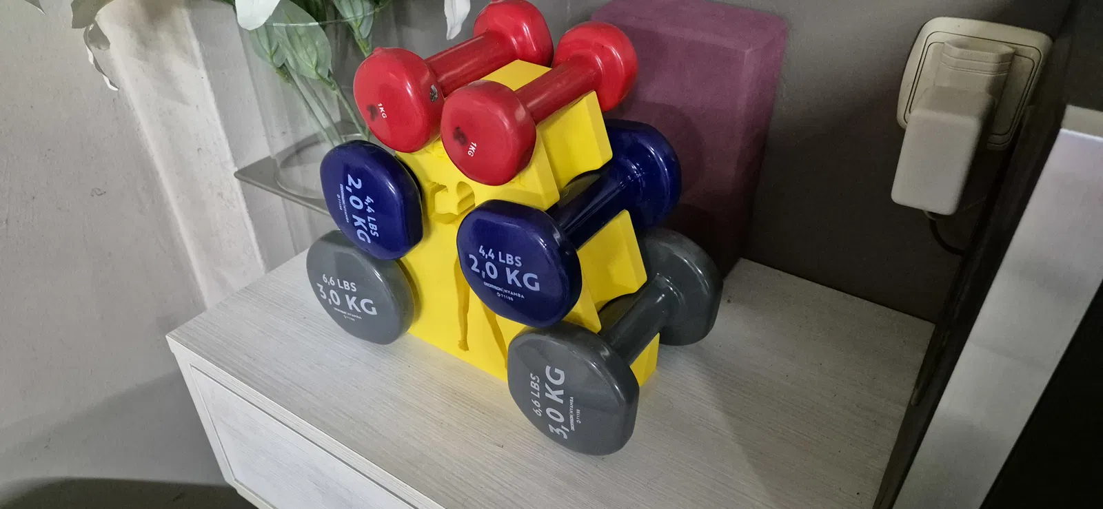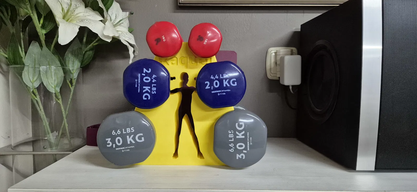 Giá đỡ nhỏ gọn dành cho tạ tay Decathlon 1kg, 2kg và 3kg. Thiết kế vững chãi, dễ in, không cần hỗ trợ (support) và tối ưu hóa vật liệu in ấn cho góc tập gym tại nhà.