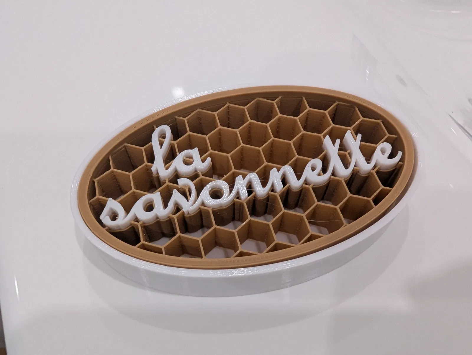 Đây là khay đựng xà phòng kiểu Pháp cho bánh xà phòng của bạn. Bề mặt phía trên được làm lõm nhẹ để giữ bánh xà phòng không bị trượt ra ngoài. Bạn có thể thử in với chế độ variable layer height (chiều cao lớp biến thiên) để giảm bớt các bậc thang trên phần chữ, nhưng thực tế thì bạn cũng khó mà nhận ra sự khác biệt đâu. Ngoài ra, bạn nên giảm tốc độ in khoảng 20% để đảm bảo các lớp đầu tiên của họa tiết tổ ong được in đẹp. Đừng quên chuyển loại infill dạng grid sang kiểu gyroid hoặc loại tương tự nhé. Kích thước tổng thể là 105mm x 67mm. Bạn hãy tùy chỉnh tỉ lệ (scale) nếu bánh xà phòng của bạn có kích thước lớn hơn.