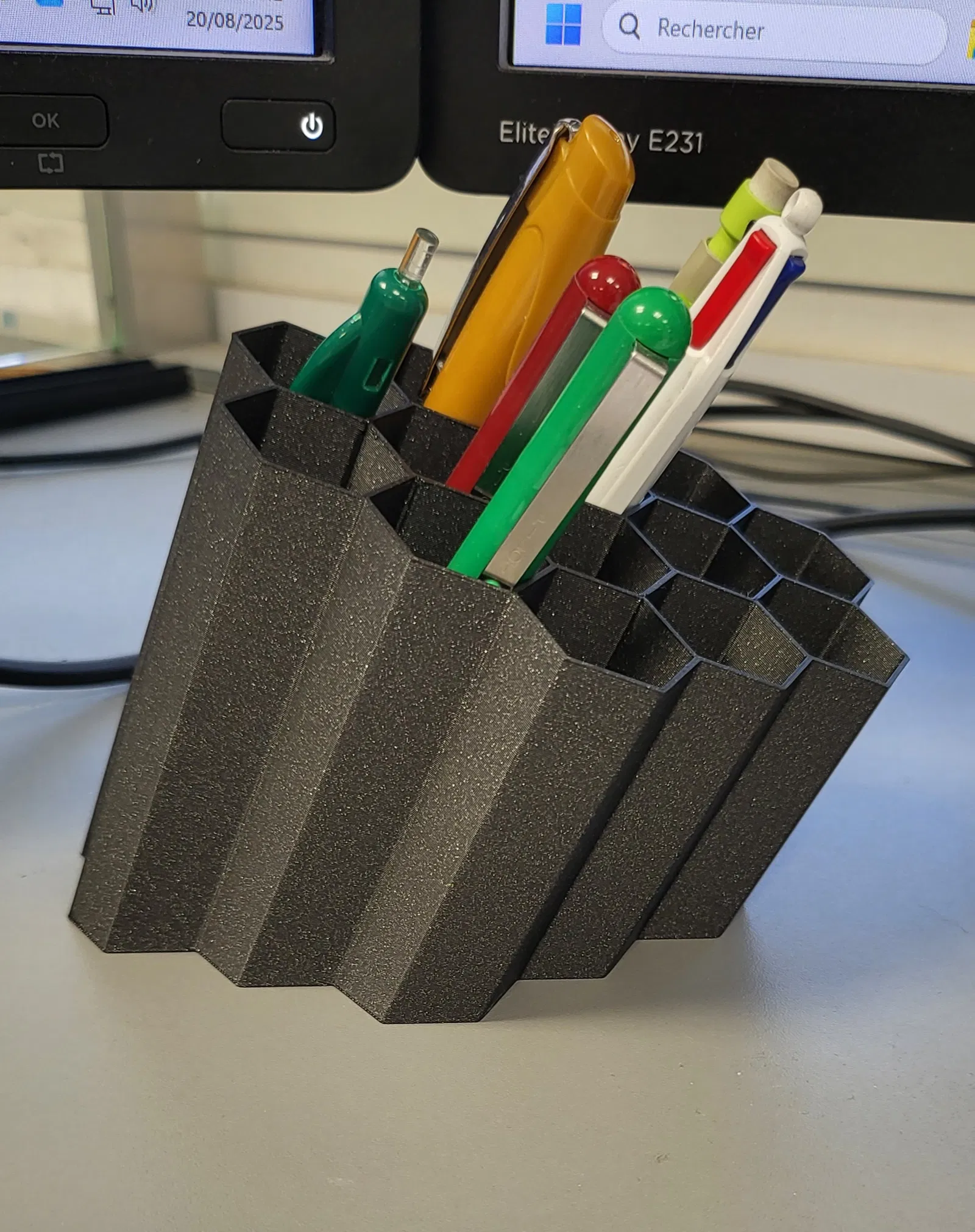 Sản phẩm này được thiết kế để tạo sự tiện lợi tối đa khi lấy đồ dùng, với các ngăn có độ cao chênh lệch nhau giúp bạn dễ dàng quan sát và chọn lựa cây bút mình cần ngay lập tức. Cấu trúc tổ ong không chỉ bền bỉ mà còn tạo nên một điểm nhấn nghệ thuật đầy tinh tế trên mặt bàn, phù hợp với mọi không gian làm việc từ đơn giản đến cầu kỳ. Đây là một món phụ kiện in 3D thực tế, giúp bàn làm việc của bạn trở nên khoa học và thẩm mỹ hơn hẳn.