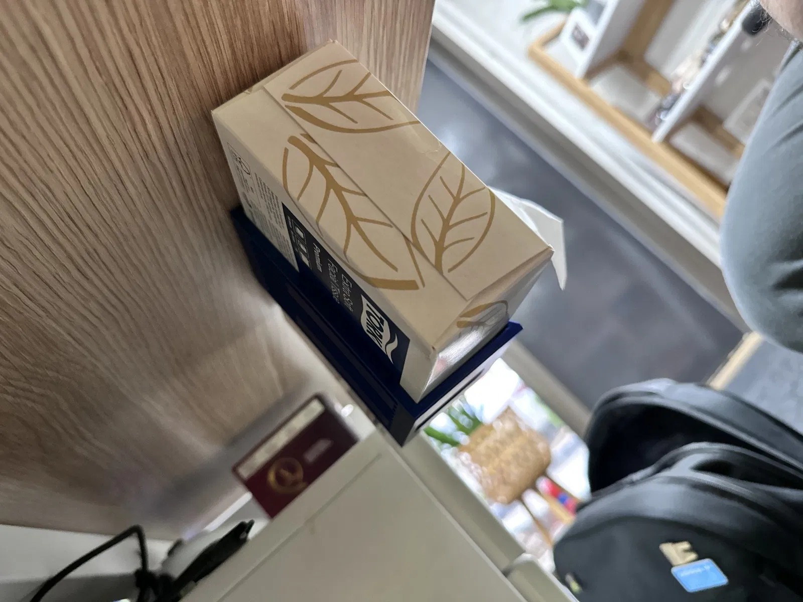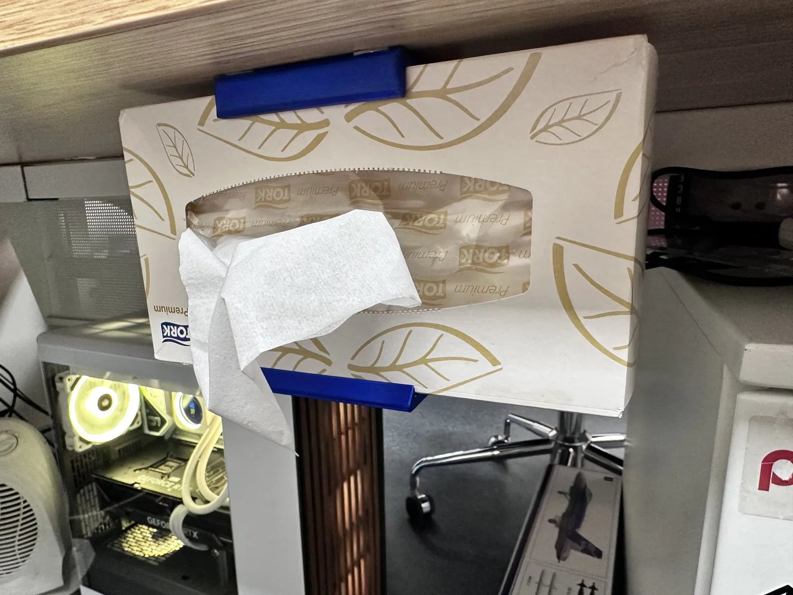Kệ đựng hộp khăn giấy dưới bàn.
