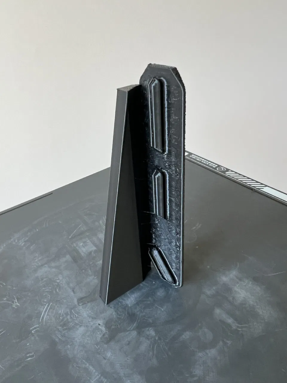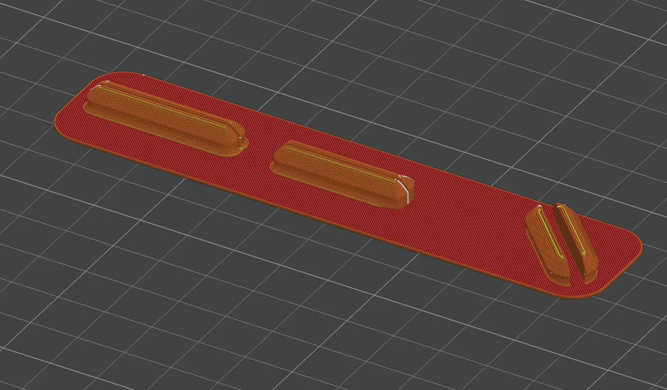 • Mẫu thứ ba được thiết kế để in đứng, cho phép bạn dùng tính năng "fuzzy skin" để tạo độ bám tốt hơn. Mình đã tinh chỉnh để không cần support ngoài phần khung hỗ trợ (support rib) đi kèm. Trong file STL có sẵn phần modifier body cho bề mặt trước. Có một cái gân hỗ trợ để tấm ốp không bị đổ khi in, phần gân này rất dễ bẻ gãy sau khi in xong. Cách mình thiết lập trong Orca slicer là import file STL hai lần: lần đầu tách body, xóa gân hỗ trợ, đặt modifier body và chỉnh fuzzy skin (spacing 0.1, độ cao 0.3mm hoặc 0.4mm sẽ ngon hơn). Lần thứ hai import, mình giữ lại gân hỗ trợ và xóa các phần khác. Việc để gân hỗ trợ thành một vật thể riêng biệt giúp không bị dính nhựa giữa gân và tấm ốp, giúp dễ bẻ gãy sau này. Mình đặt gân hỗ trợ với infill 10% thôi cho tiết kiệm. Phần này in ra các chốt có thể hơi dày một chút, bạn chỉ cần giũa nhẹ hai cạnh dài của chốt để đạt kích thước 0.275" cho chốt nhỏ và 0.39" cho chốt chéo là vừa đẹp.