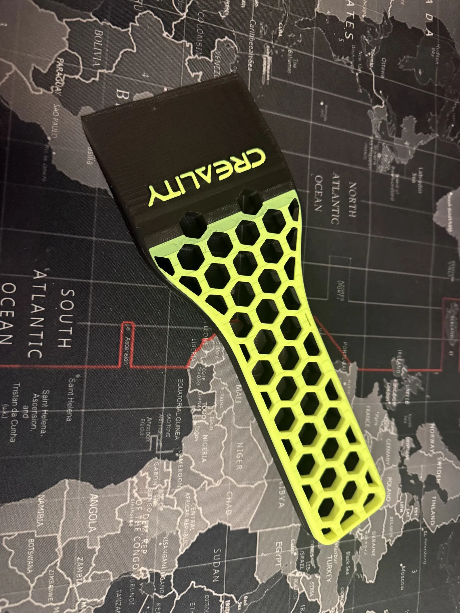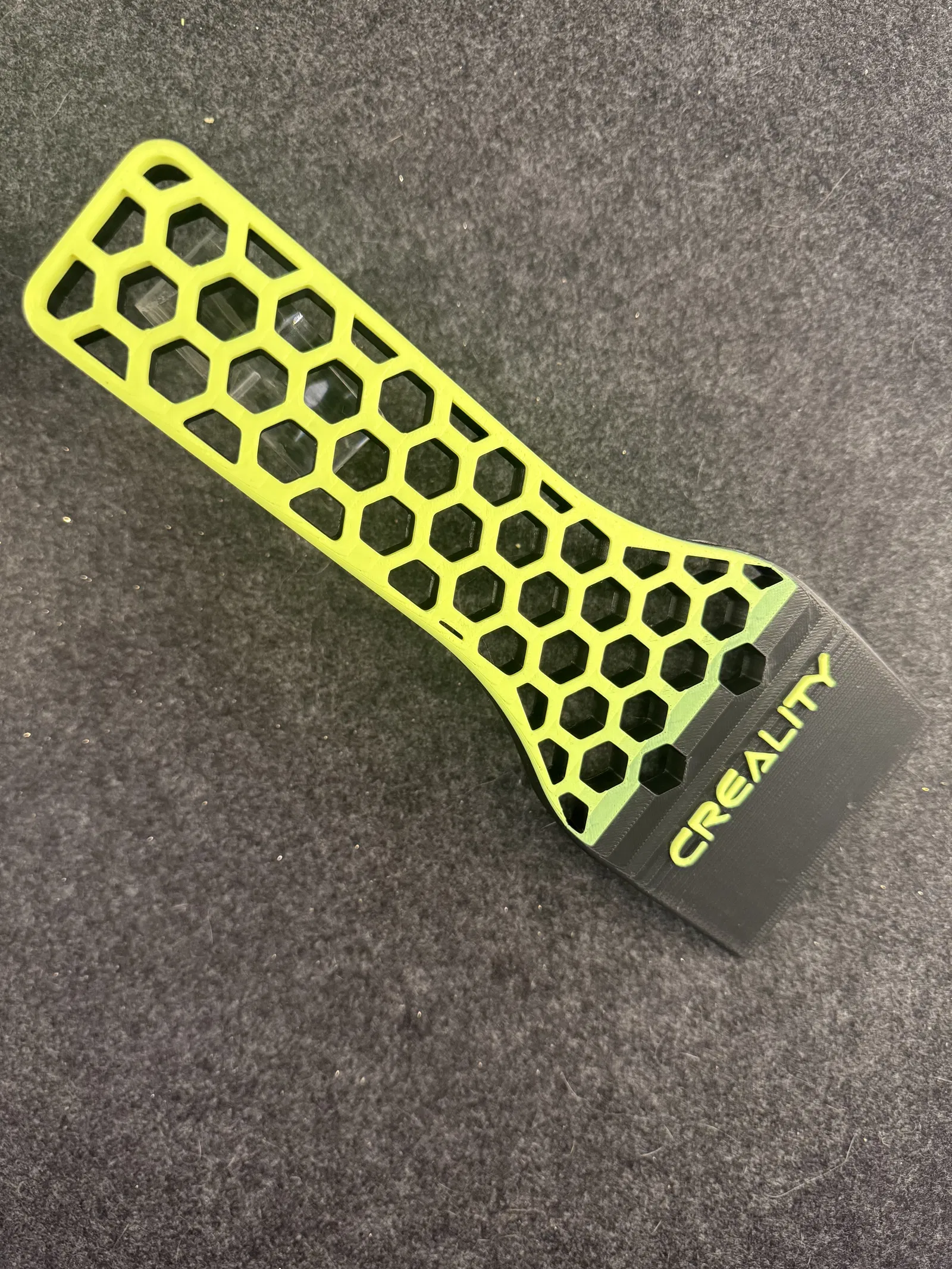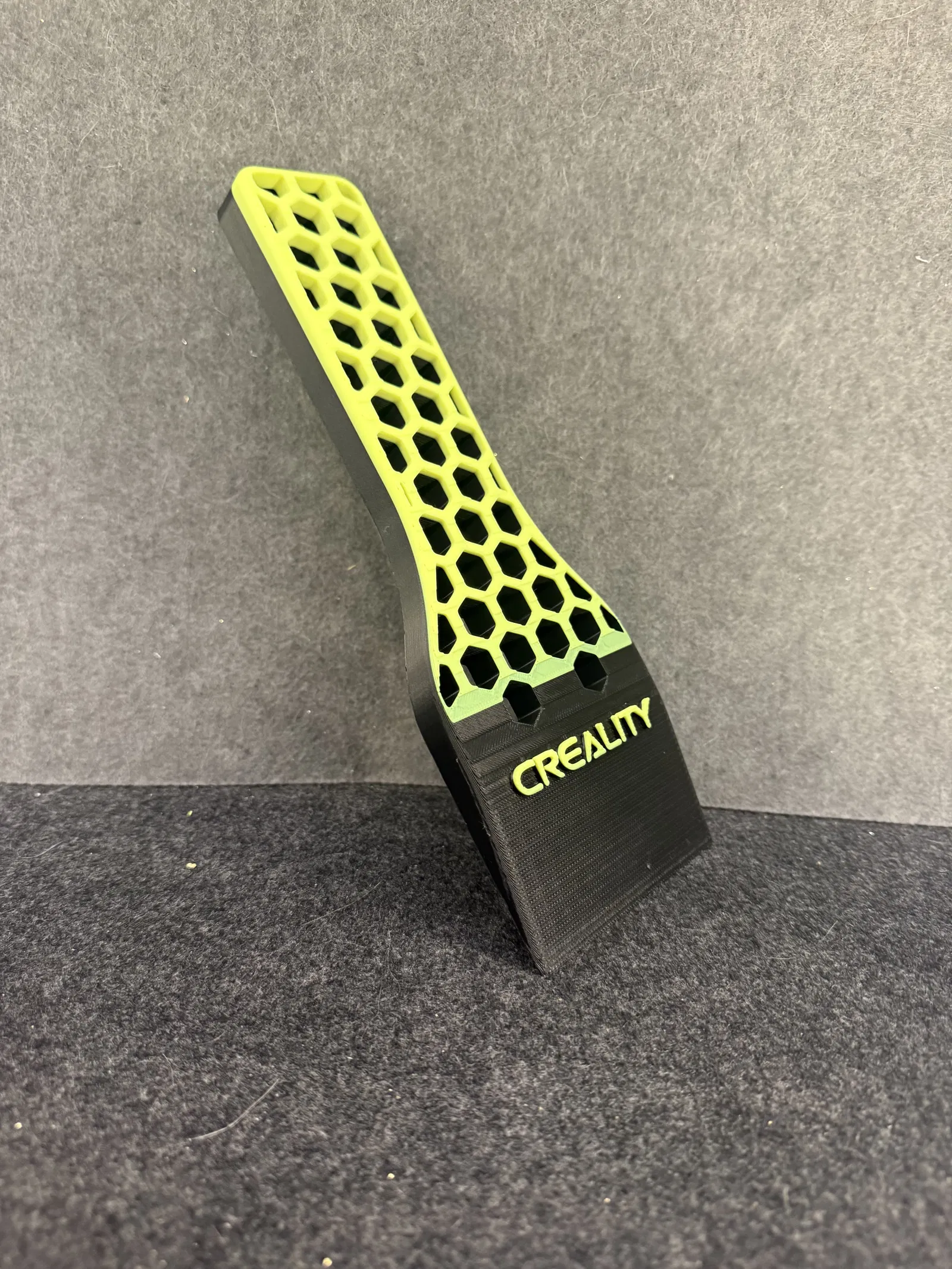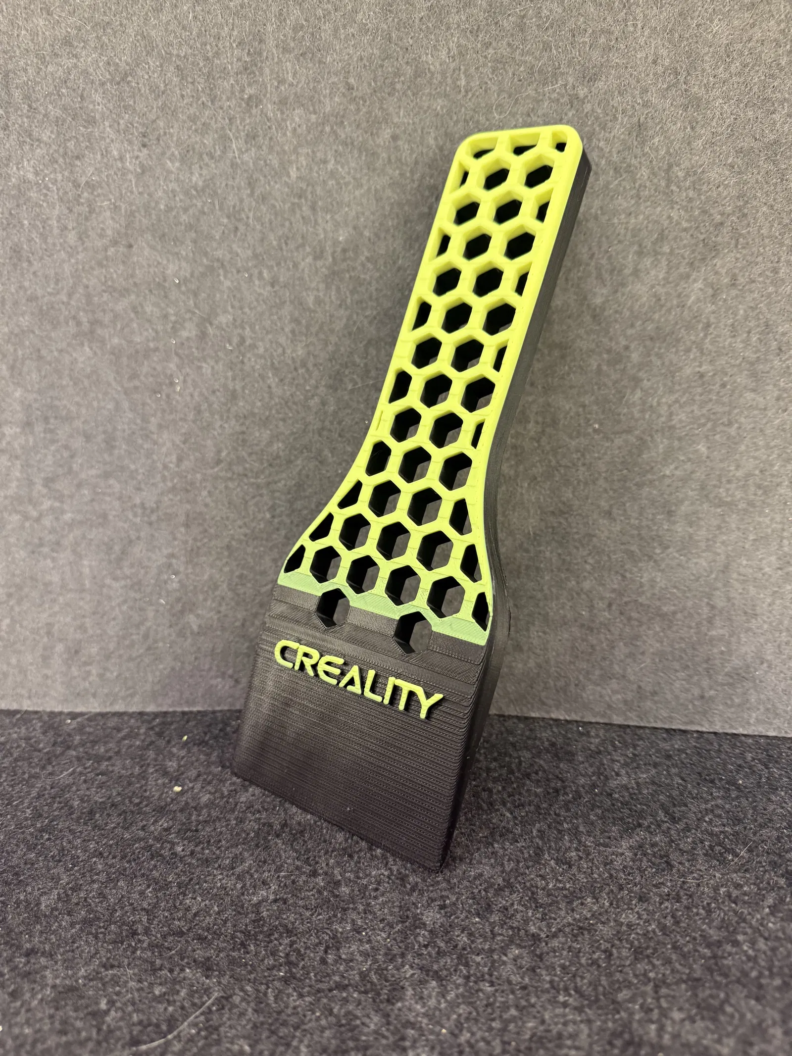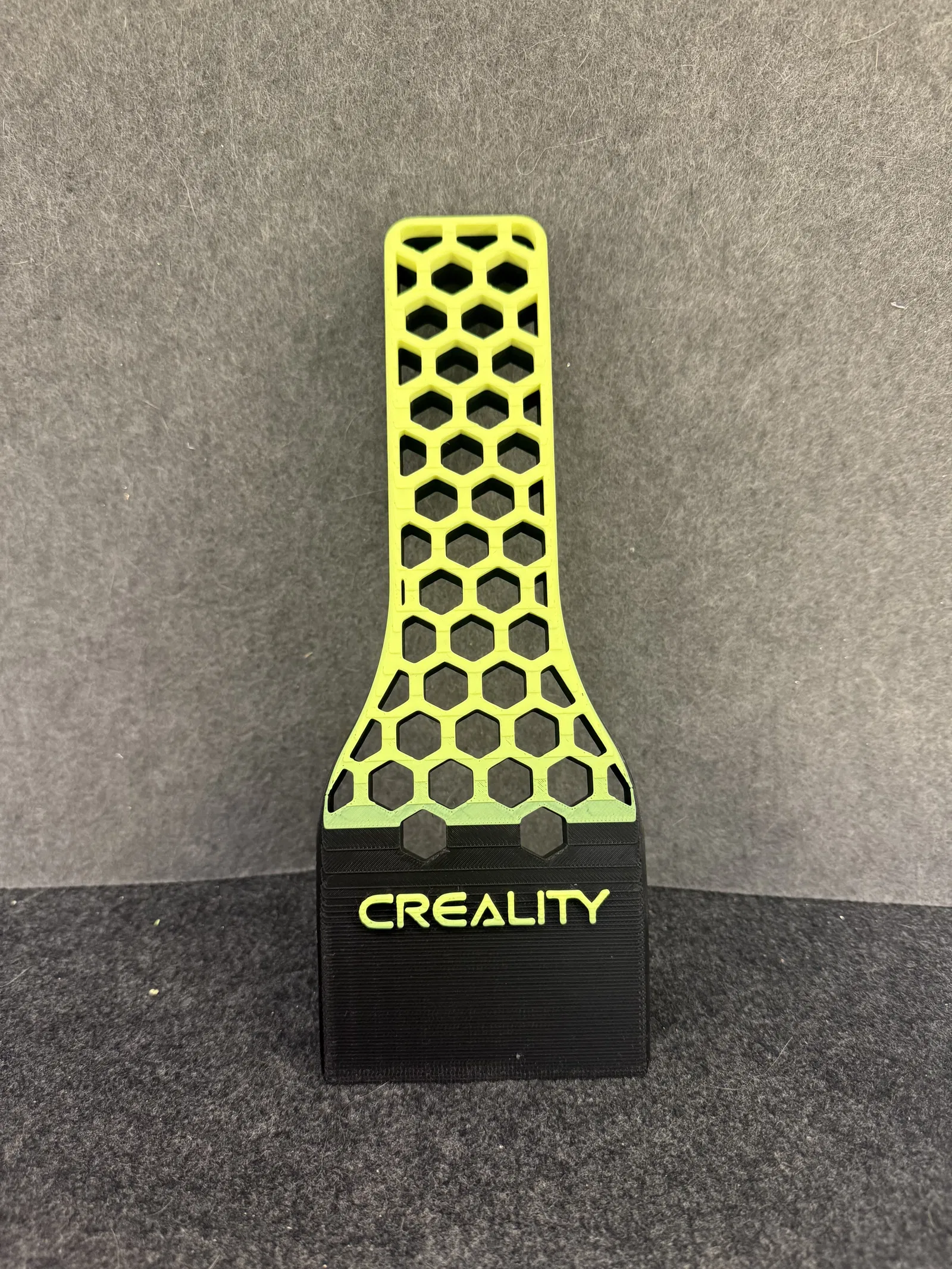 Sản phẩm này có cấu tạo thông minh với phần lưỡi dao cứng cáp, đủ mỏng để len lỏi vào các khe nhỏ giữa vật in và bàn in, đồng thời đủ bền để chịu lực tốt. Phần tay cầm được tối ưu hóa với họa tiết lục giác, vừa giúp giảm trọng lượng sản phẩm, vừa tiết kiệm nguyên liệu in nhưng vẫn giữ được độ cứng cần thiết. Bạn có thể in bằng hai màu nhựa khác nhau như trong hình để làm nổi bật logo CREALITY, tạo nên vẻ ngoài chuyên nghiệp và ấn tượng.