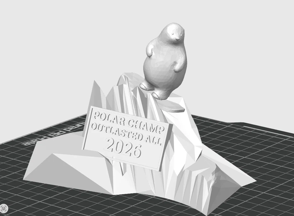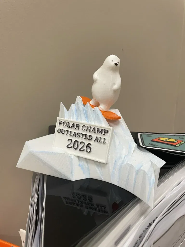 Cúp Polar Plunge – Giải thưởng cho sự kiện học đường. Chiếc cúp Polar Plunge này là một phần thưởng thú vị và đầy kỷ niệm, được thiết kế đặc biệt cho các sự kiện mùa đông tại trường học, hoạt động gây quỹ hoặc bất kỳ sự kiện nào vinh danh những người dũng cảm đối mặt với cái lạnh. Chiếc cúp này là phiên bản remix kết hợp giữa mô hình Gấu Bắc Cực trượt tuyết (Snowboarding Polar Bear) của KUMATY (https://www.thingiverse.com/thing:2879472) cho chú gấu và các mô hình Tảng băng trôi (Icebergs) của Jimbotron (https://www.thingiverse.com/thing:4662158) cho chim cánh cụt, phần đế băng và phong cảnh Bắc Cực. Thiết kế này tạo nên một chiếc cúp theo chủ đề Bắc Cực vô cùng ấn tượng với chú gấu đứng kiêu hãnh trên đỉnh băng cùng các chi tiết chim cánh cụt. Bạn có thể tùy chỉnh kích thước cũng như màu sắc của sợi in (filament) hoặc sơn màu sao cho phù hợp với sự kiện của mình. Xin gửi lời cảm ơn đến KUMATY vì mô hình gấu và Jimbotron vì các chi tiết chim cánh cụt, tảng băng và phong cảnh; vui lòng tham khảo trang gốc trên Thingiverse để biết thêm về giấy phép và quyền remix.