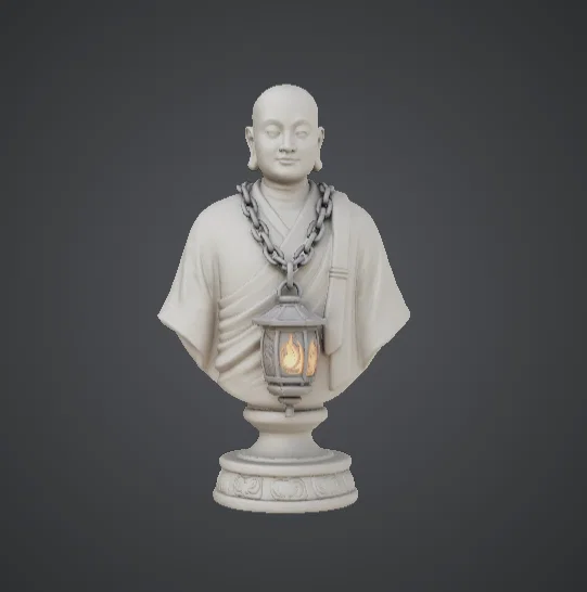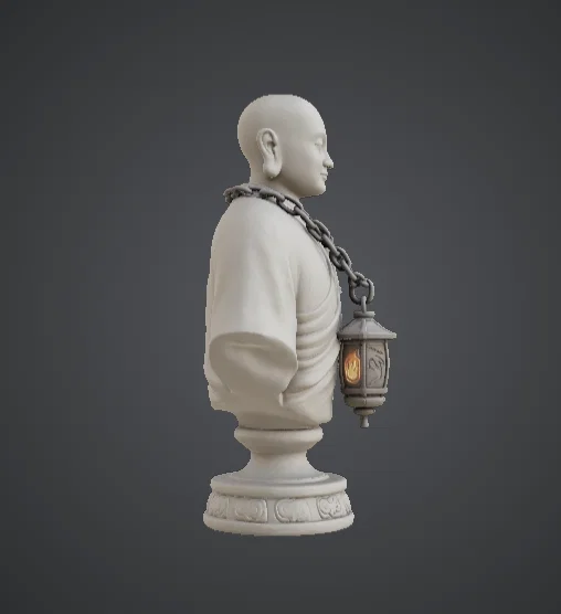 Mẫu tượng bán thân vị sư đầy thanh tịnh, kết hợp với chiếc đèn lồng treo tạo điểm nhấn độc đáo. Thiết kế tinh xảo, dễ in, phù hợp để trang trí hoặc sáng tạo thêm với đèn LED và kỹ thuật tô màu.