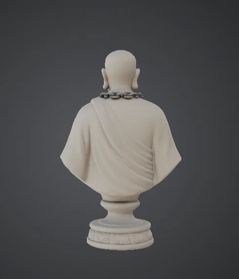 Mẫu tượng bán thân vị sư kèm đèn này kết hợp giữa nét điêu khắc bình thản, tập trung vào nhân vật với điểm nhấn tinh tế là chiếc đèn lồng treo. Tượng được thiết kế với các đường nét khuôn mặt mượt mà và hình dáng y phục đơn giản, tạo nên một tổng thể cân đối và hài hòa. Một sợi xích nặng vắt qua vai, nâng đỡ chiếc đèn lồng ở vị trí trung tâm, giúp tăng thêm độ tương phản và tạo điểm nhấn thị giác cho toàn bộ tác phẩm.