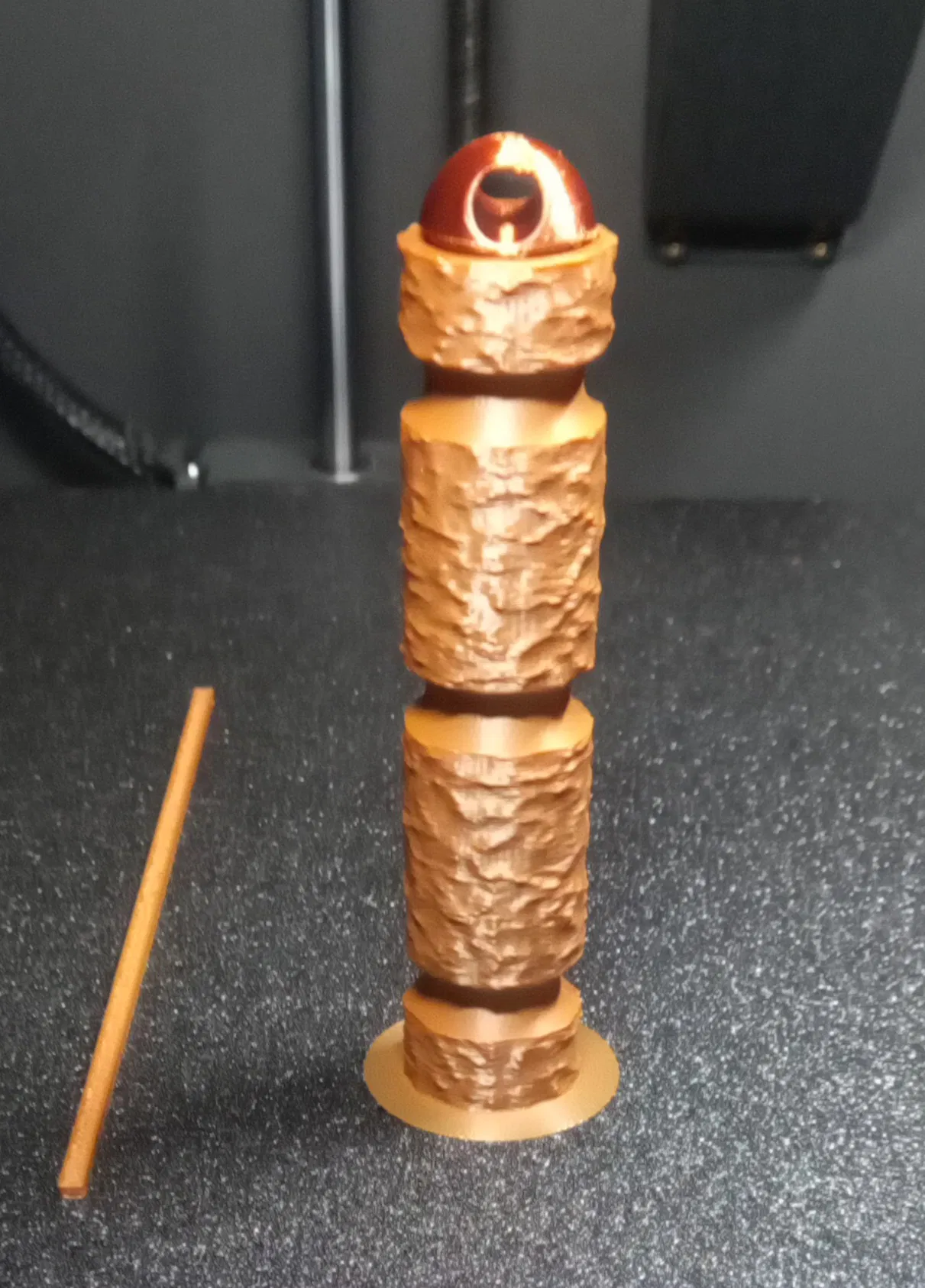Đây là mẫu dao găm mảnh đầu tiên mà mình thiết kế. Mình có sử dụng tính năng fuzzy skin cho phần tay cầm, với các thông số: displacement mode, ridged multifractal, fuzzy skin point distance 0.6, độ dày 0.3, feature size 4 và octaves 10. Mình in bằng nhựa brown PLA và bronze silk PLA.
