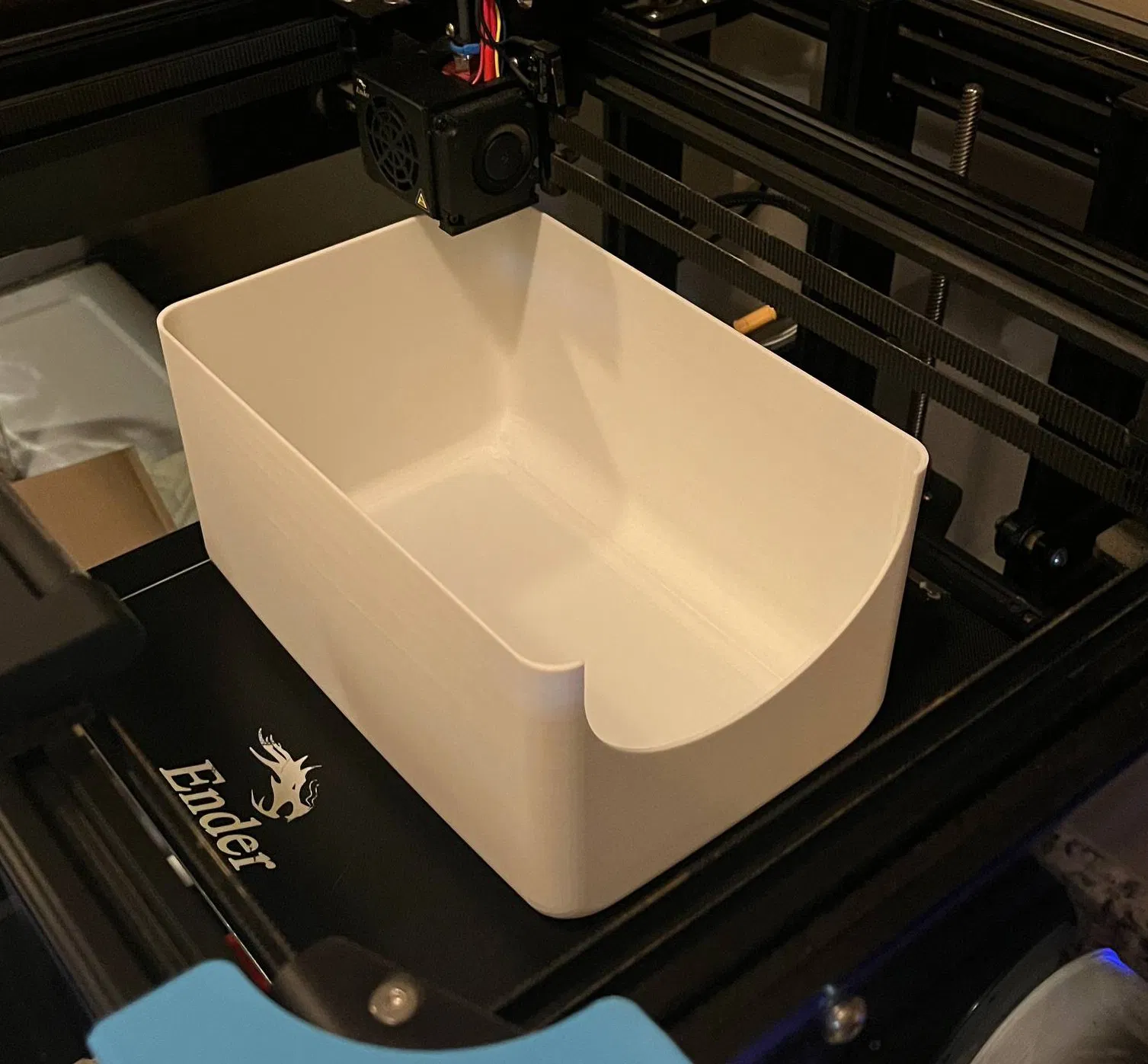 Khay tắm cát thành cao (7x9x5 inch) giúp hạn chế tình trạng văng cát ra ngoài khi chim cút tắm. Thiết kế đơn giản, dễ in, không cần support, khuyến khích dùng nhựa PLA+ với 100% infill để đảm bảo độ bền tối ưu cho chuồng chim.