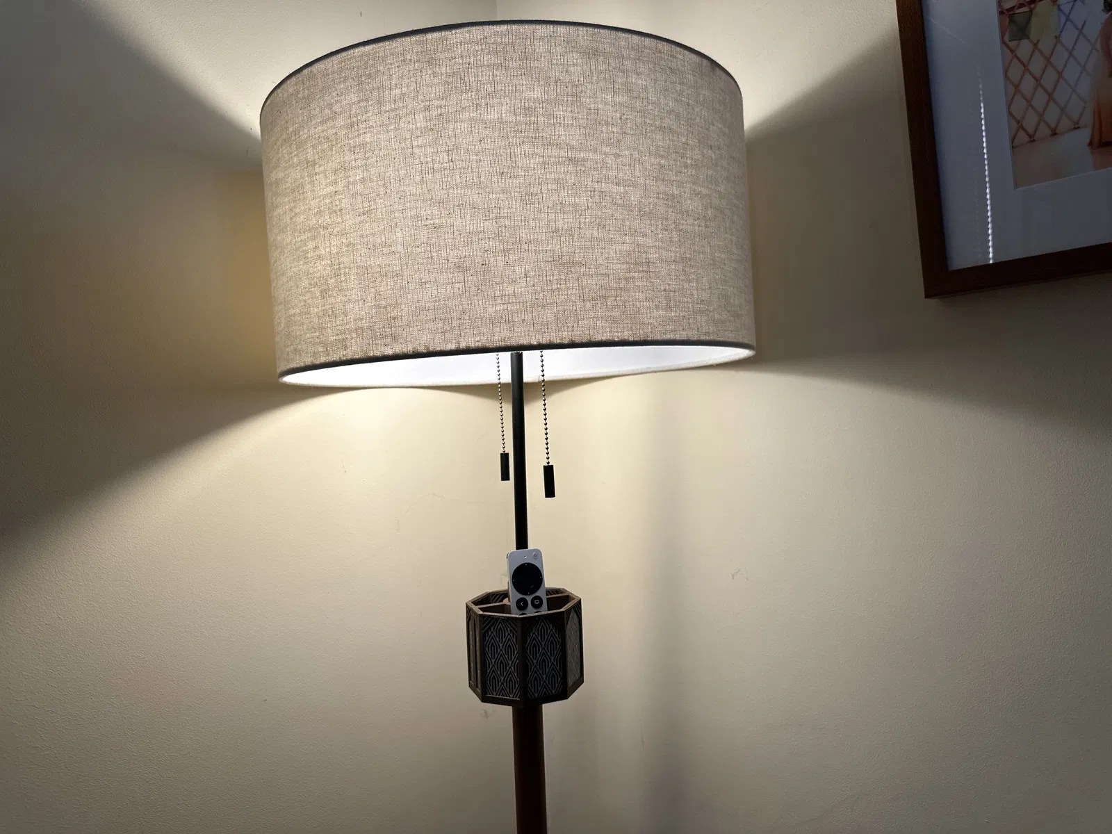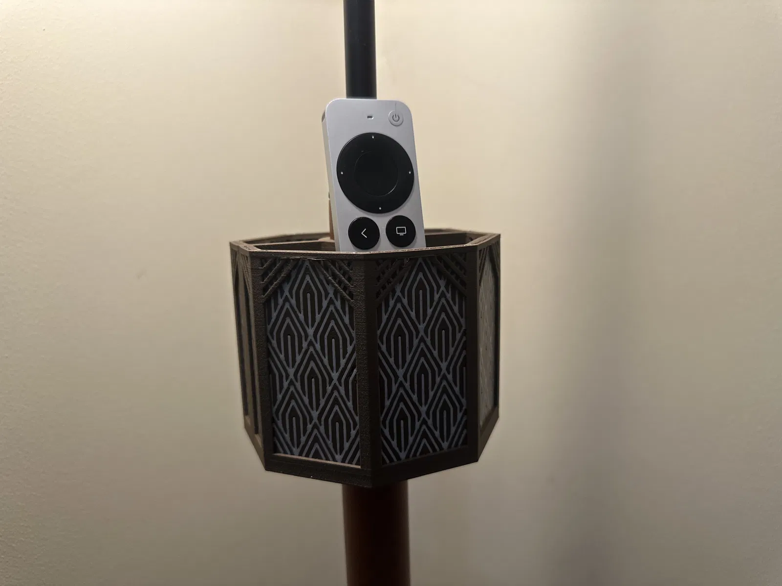 Mấy đứa nhỏ nhà mình cứ làm mất remote trong mấy kẽ ghế sofa hoài. Vì quá bực bội cộng thêm tính thích làm quá mọi chuyện, mình đã thiết kế cái giá đỡ phong cách Art-deco này để kẹp vào thân đèn sàn.