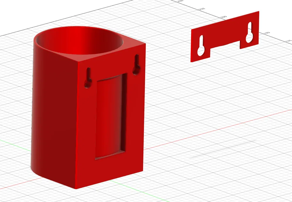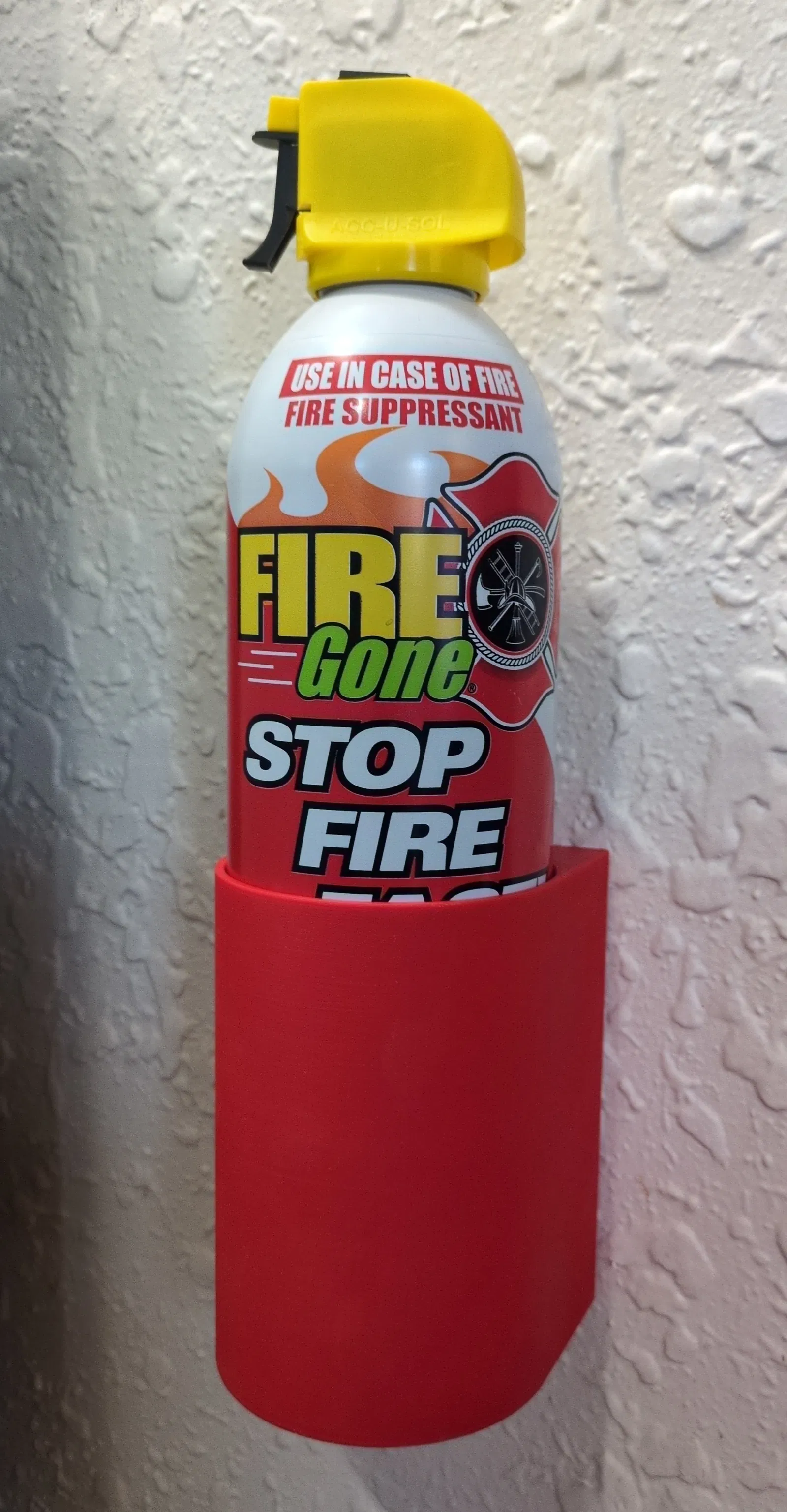 Tôi có một bình chữa cháy mini "Fire Gone" mua để đi cắm trại nhưng vẫn chưa có dịp dùng, nên nó cứ nằm chiếm chỗ trên mặt bàn mãi. Giá treo này có thể dùng cho bất kỳ vật hình trụ nào có đường kính dưới 68mm. Tôi in bằng nhựa màu đỏ cho đúng chất "cứu hỏa".