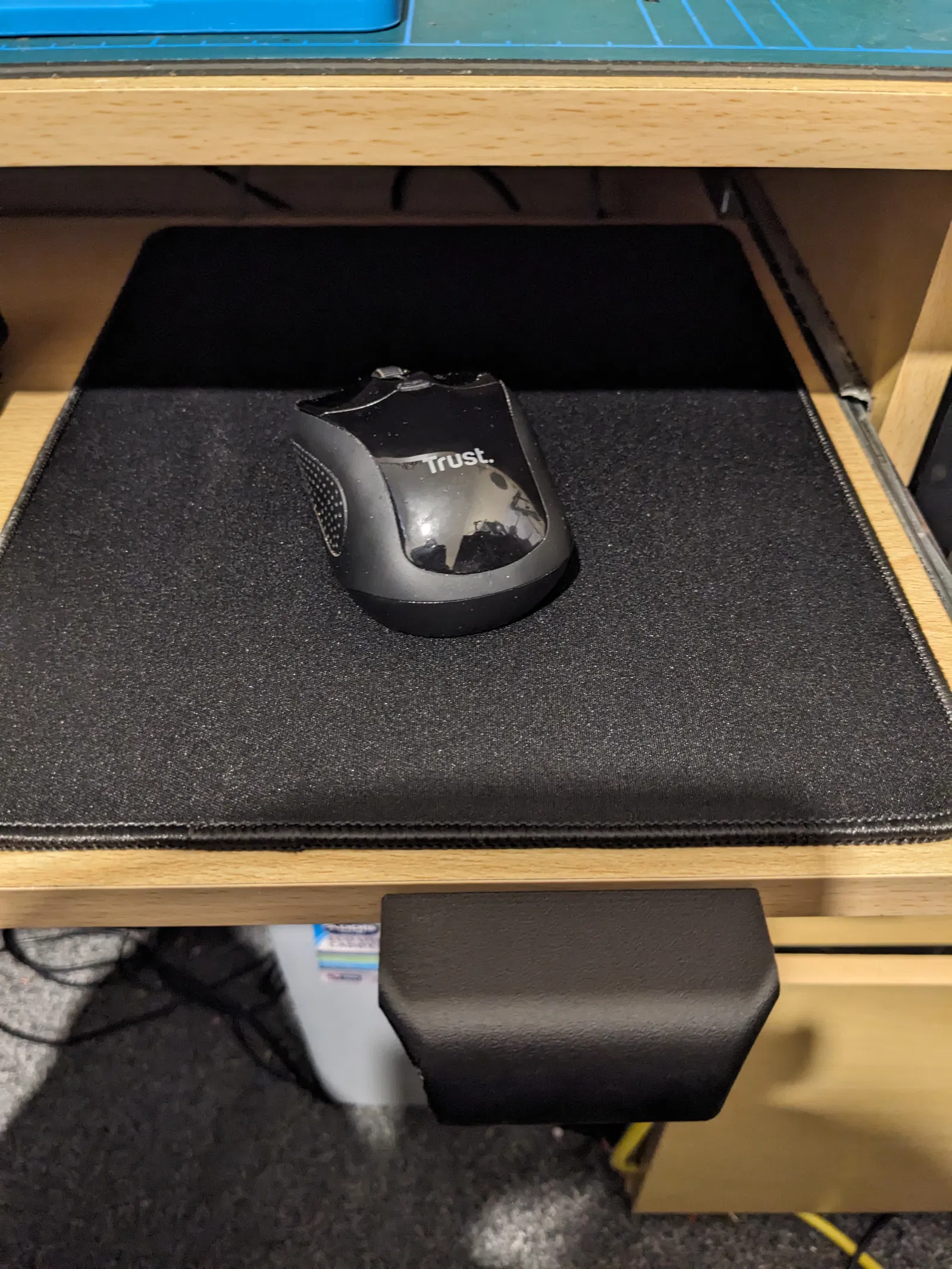 Tay cầm tiện lợi gắn vào khay bàn phím, giúp kéo ra dễ dàng và đóng vai trò như miếng kê cổ tay khi dùng chuột. Dễ dàng in bằng chất liệu PLA, PETG hoặc PETG-CF. Lưu ý cần cài đặt hỗ trợ (supports) khi in để đạt hiệu quả tốt nhất.