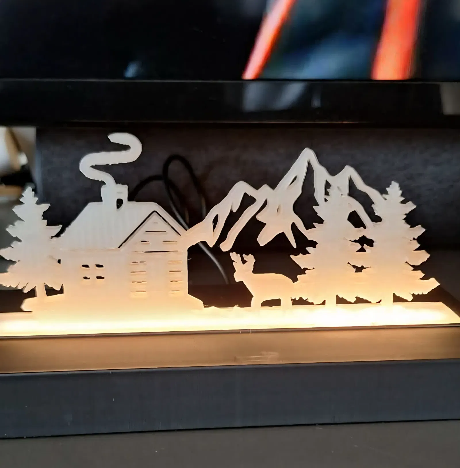 Đây là mẫu đèn LED với 2 miếng tán sáng. Các miếng tán sáng được thiết kế theo hình ảnh phong cảnh núi non, trong đó có một miếng in hình căn nhà gỗ giữa rừng. Các miếng tán sáng được in bằng nhựa PLA trong suốt. Bạn có thể mua nguồn điện và dây đèn LED dán ở trên Amazon để hoàn thiện sản phẩm nhé.