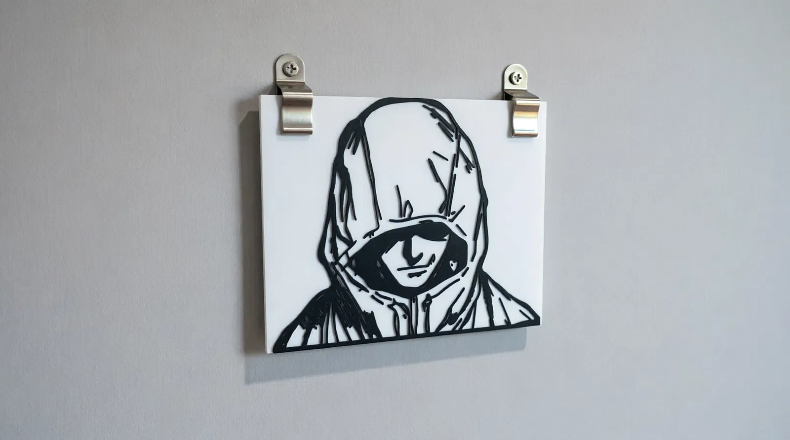 Tấm ốp tường phong cách với hình bóng Yuji Itadori đội mũ trùm đầu biểu tượng từ bộ phim Jujutsu Kaisen. Thiết kế đồ họa tối giản trắng đen này làm nổi bật vẻ ngoài đầy bí ẩn và sức mạnh của một trong những nhân vật chính của JJK.