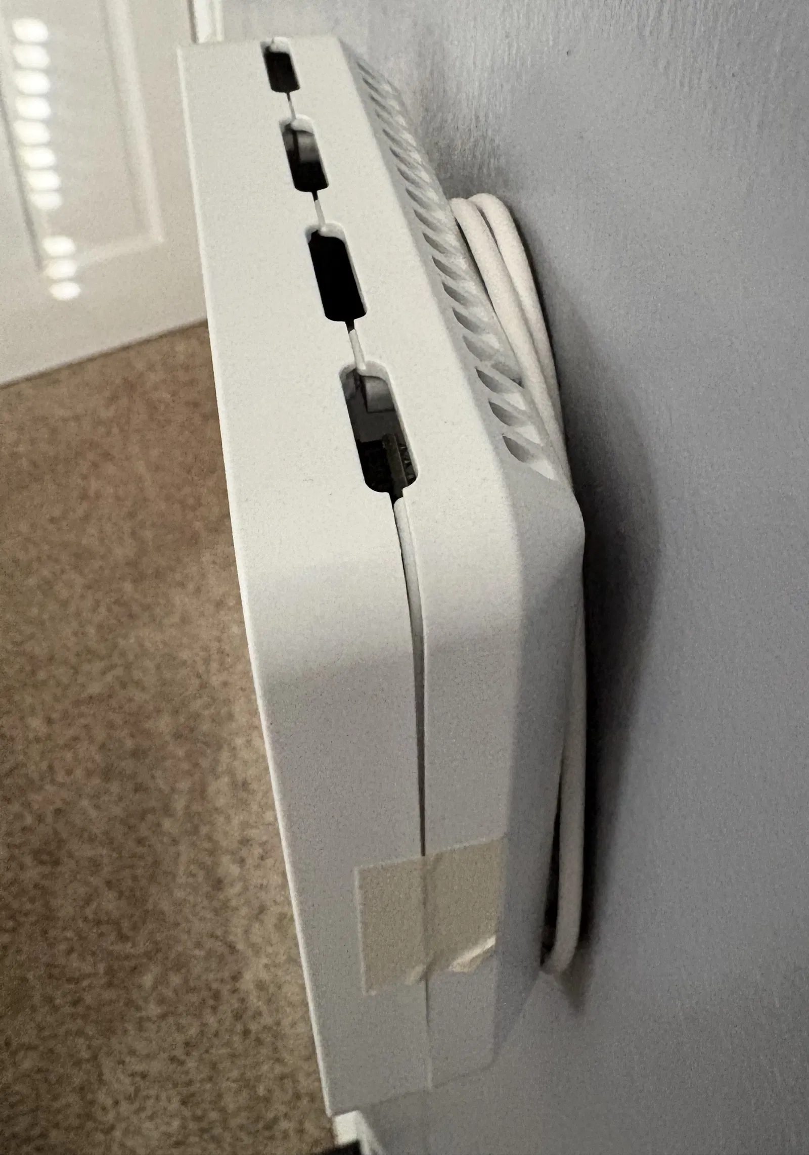 Được thiết kế bằng Fusion 360. Bạn chỉ cần gắn giá treo lên tường trước, sau đó đặt thiết bị vào là xong. Không cần in support. Mình có tích hợp thêm phần cuộn dây cáp đi kèm để nhìn cho gọn gàng.