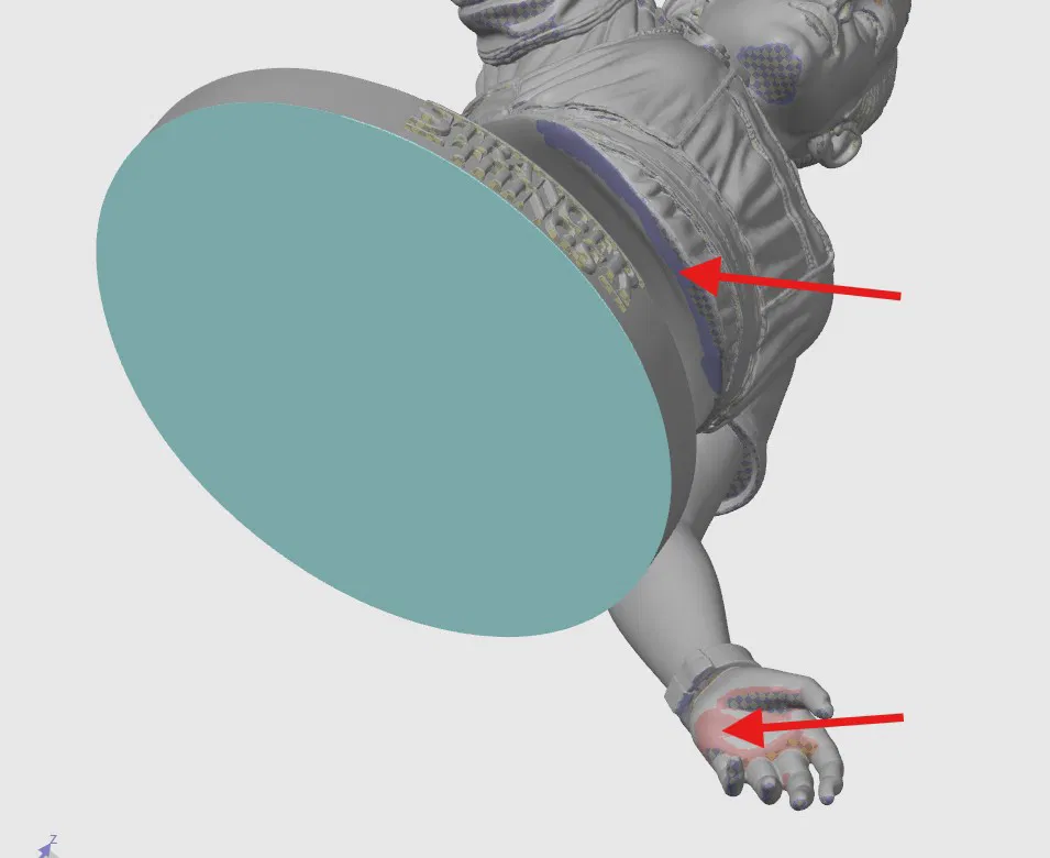 Phần hỗ trợ (tree support) hơi khó xử lý một chút. Mình khuyến khích nên để mặc định ở mức 28°, nhưng hãy chặn (block) hỗ trợ ở một vài vị trí trên bàn tay và thay vào đó là vẽ thêm một đường support bên dưới bụng, xem hình minh họa bên dưới.