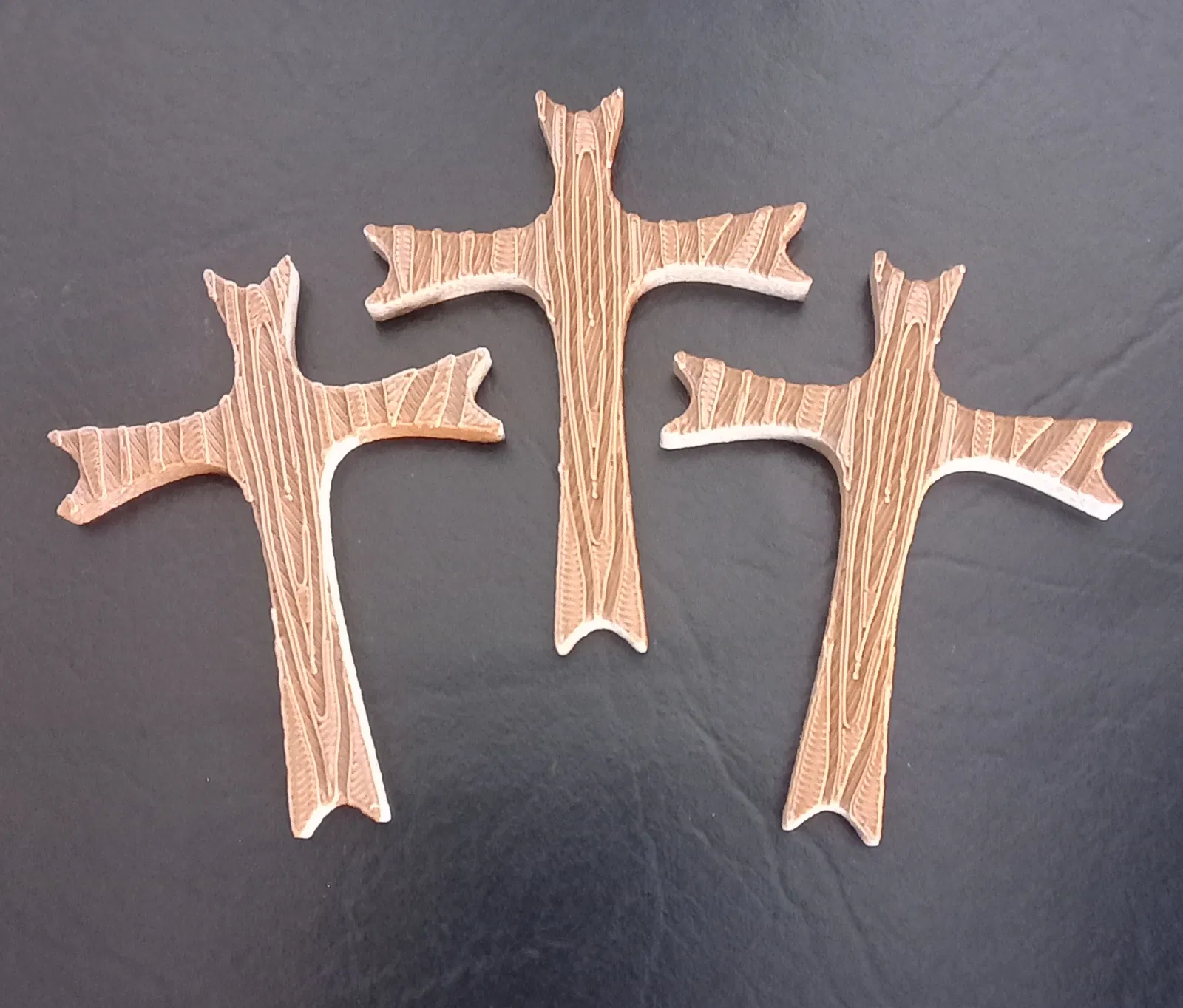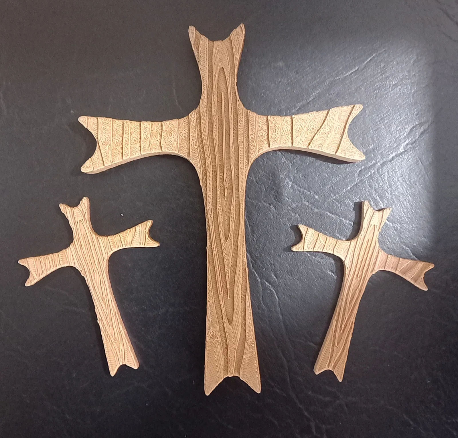 Mình muốn cây thánh giá này nhìn có kết cấu độc đáo một chút, nên mình đã in thử mấy mẫu trong hình bằng sợi nhựa twin colour do mình tự phối từ hai loại Sunlu PLA+ là màu gỗ sồi (oak) và màu nâu cà phê đậm. Các bạn có thể tùy chỉnh phóng to hoặc thu nhỏ tùy ý trong phần mềm slicer nhé. Phần mặt bên mình có dùng tính năng fuzzy skin và dùng chế độ Octagram Spiral cho bề mặt trên cùng. Cây thánh giá lớn trong ảnh mình đã scale lên 500% đó.